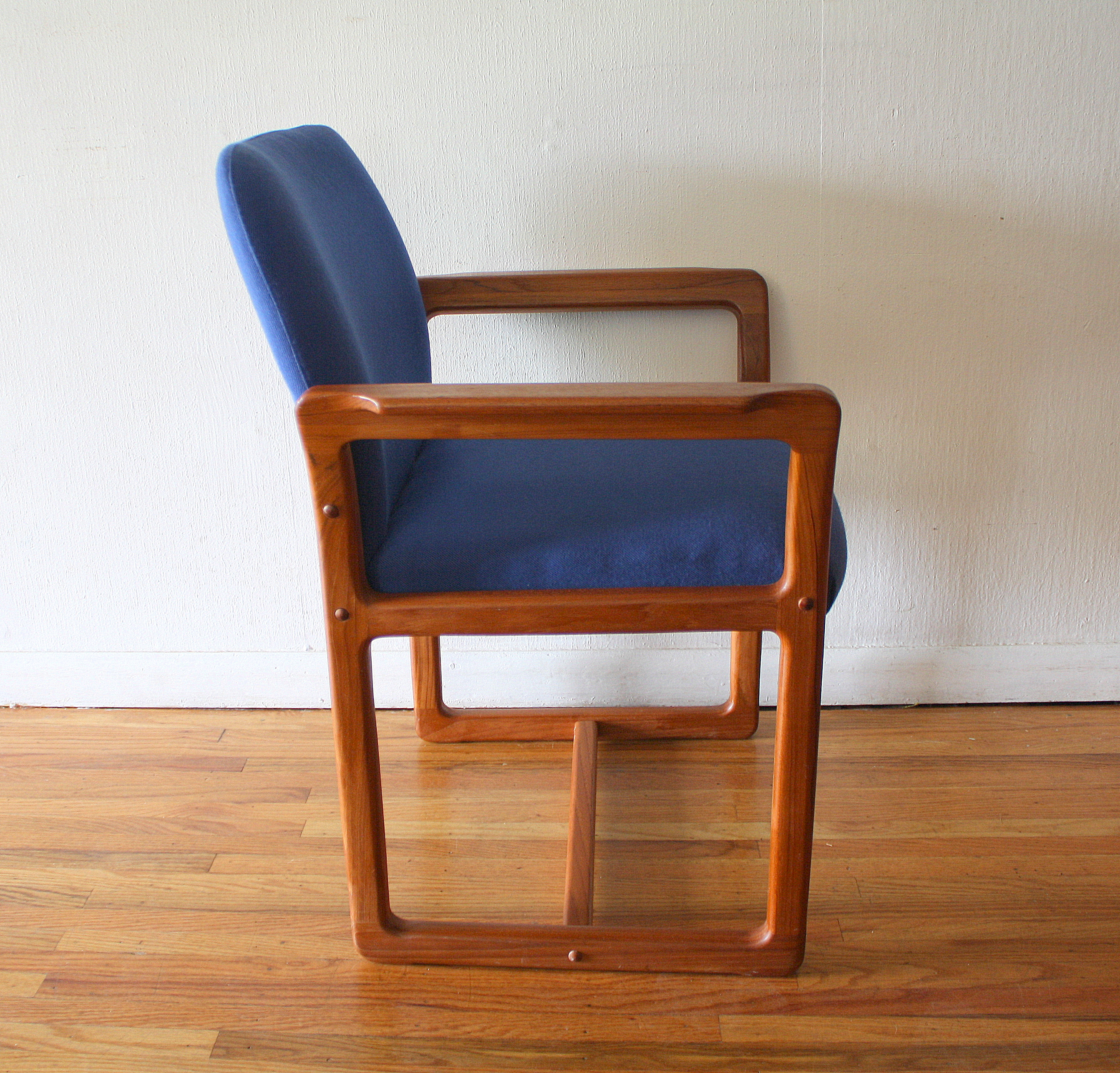 This is a mid century modern Danish teak arm chair upholstered in cobalt blue. The chair has beautiful curves...