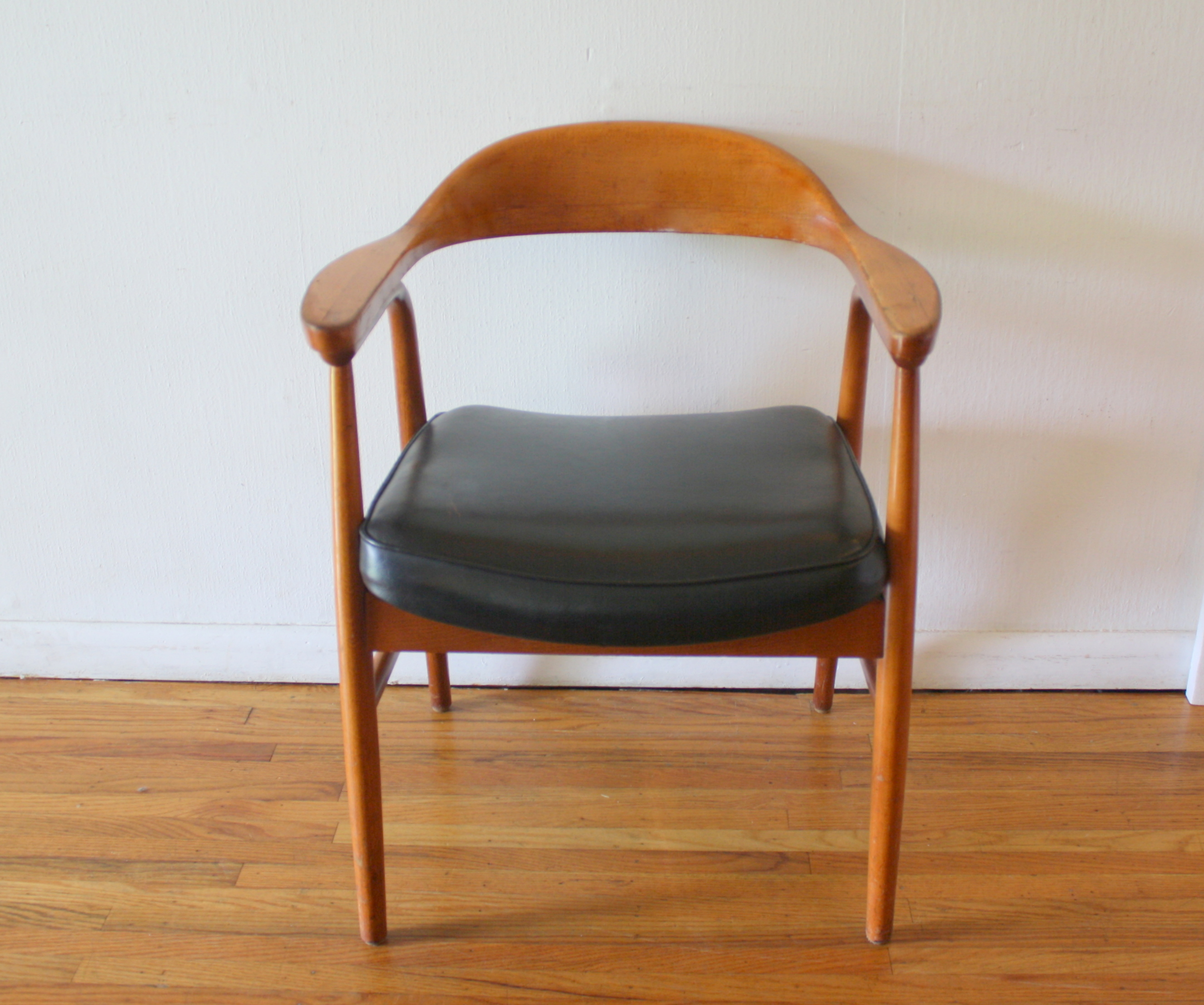 This is a mid century modern arm chair with a curved solid wood frame and black naugahyde seat. Dimensions:...