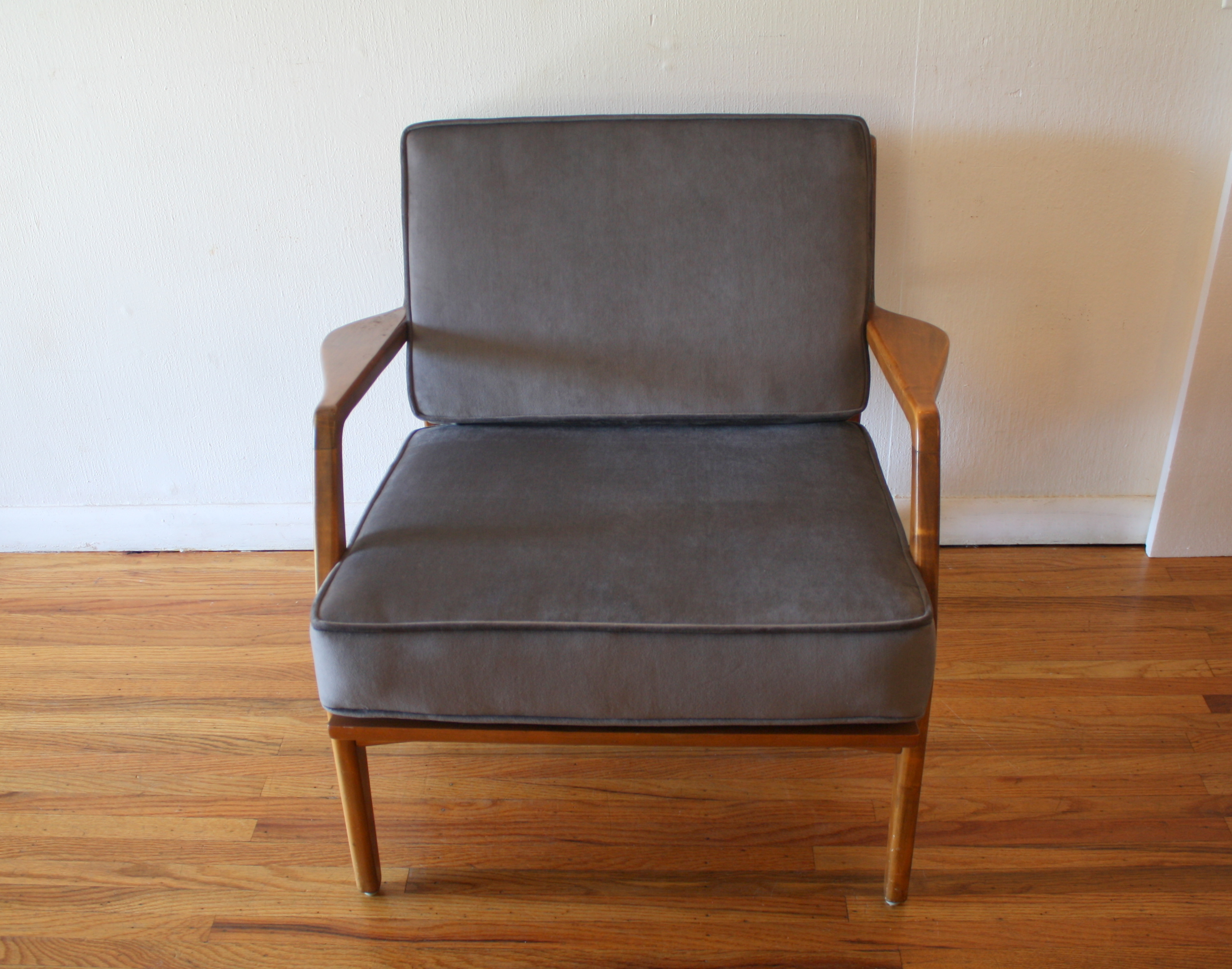 This is a mid century modern arm lounge chair with a solid wood frame, sculpted arms, and newly upholstered...