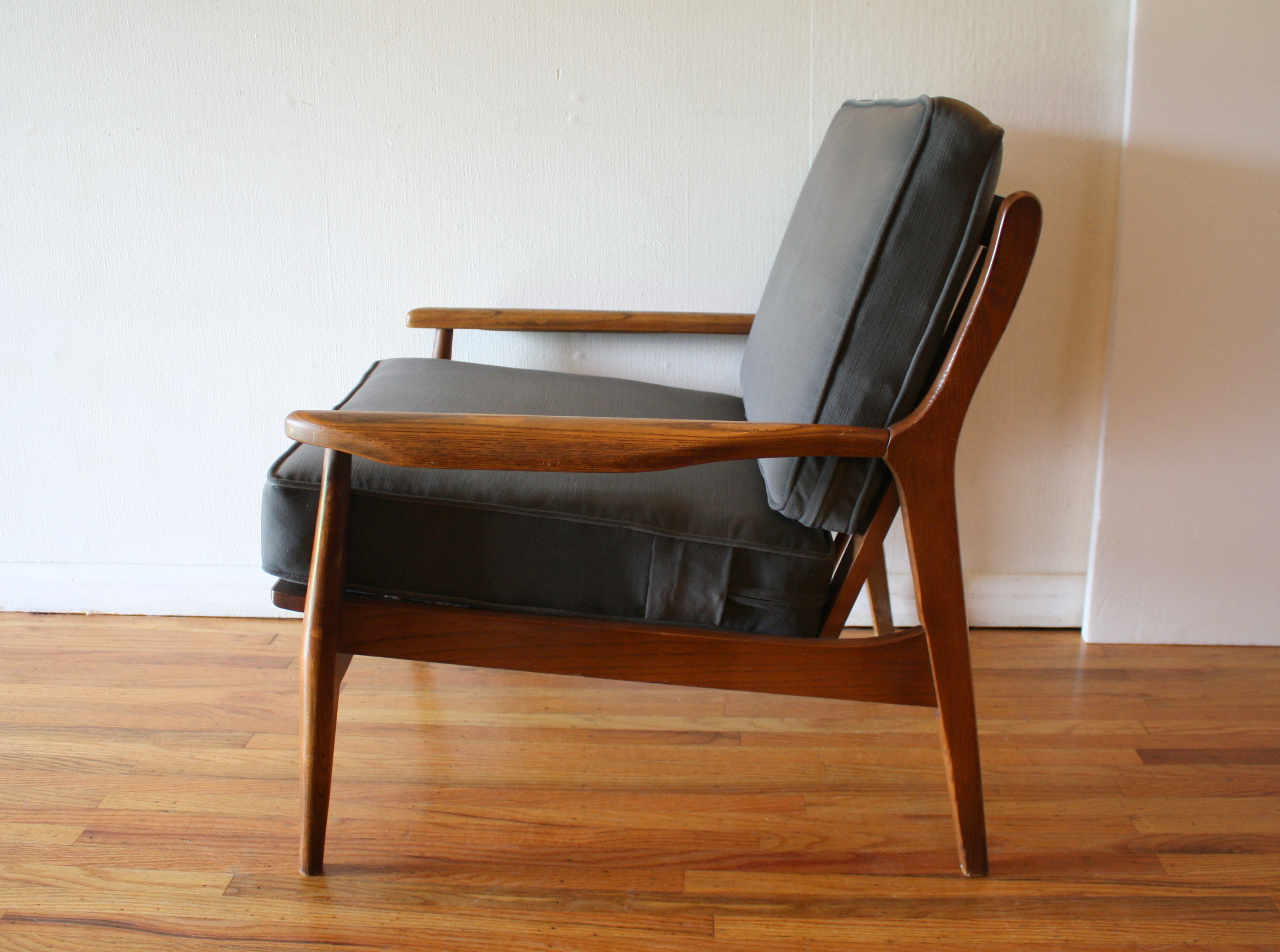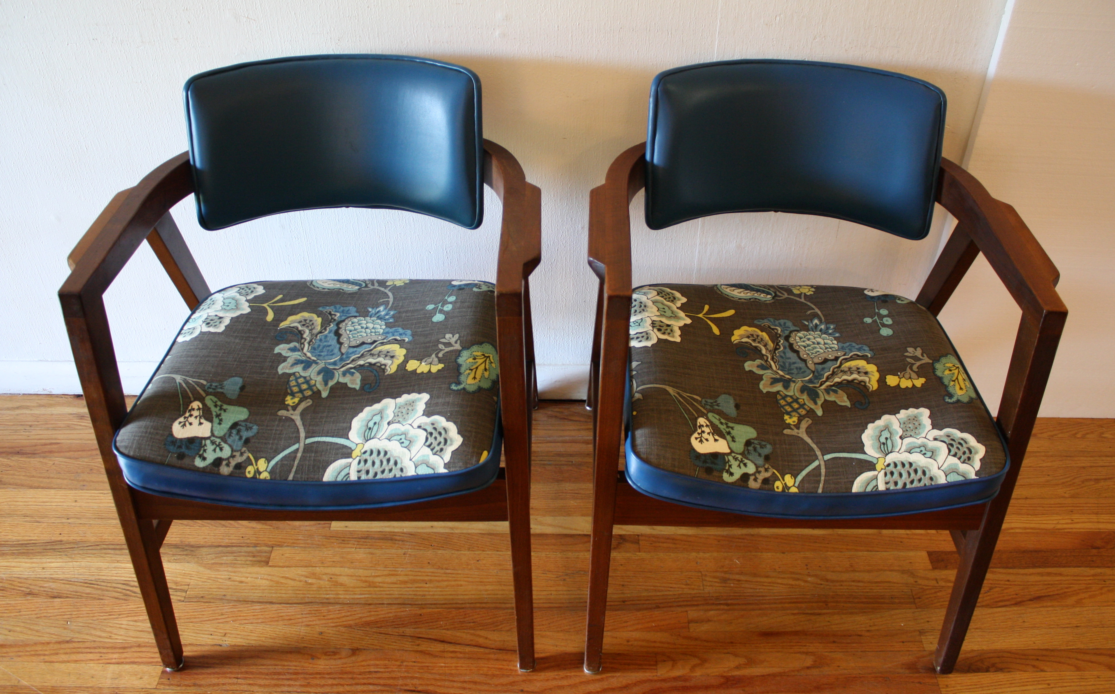 This is a pair of mid century modern arm chairs by Gunlocke, with sculpted solid wood frames. We kept...