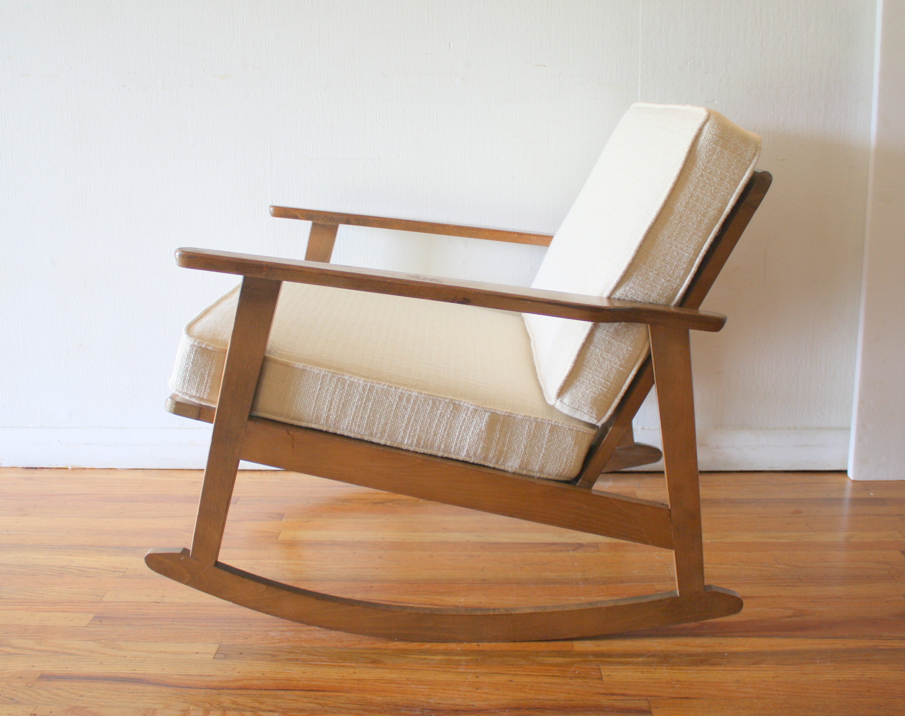 This is a mid century modern rocker chair. It has a solid wood frame, and 2 new upholstered cushions...