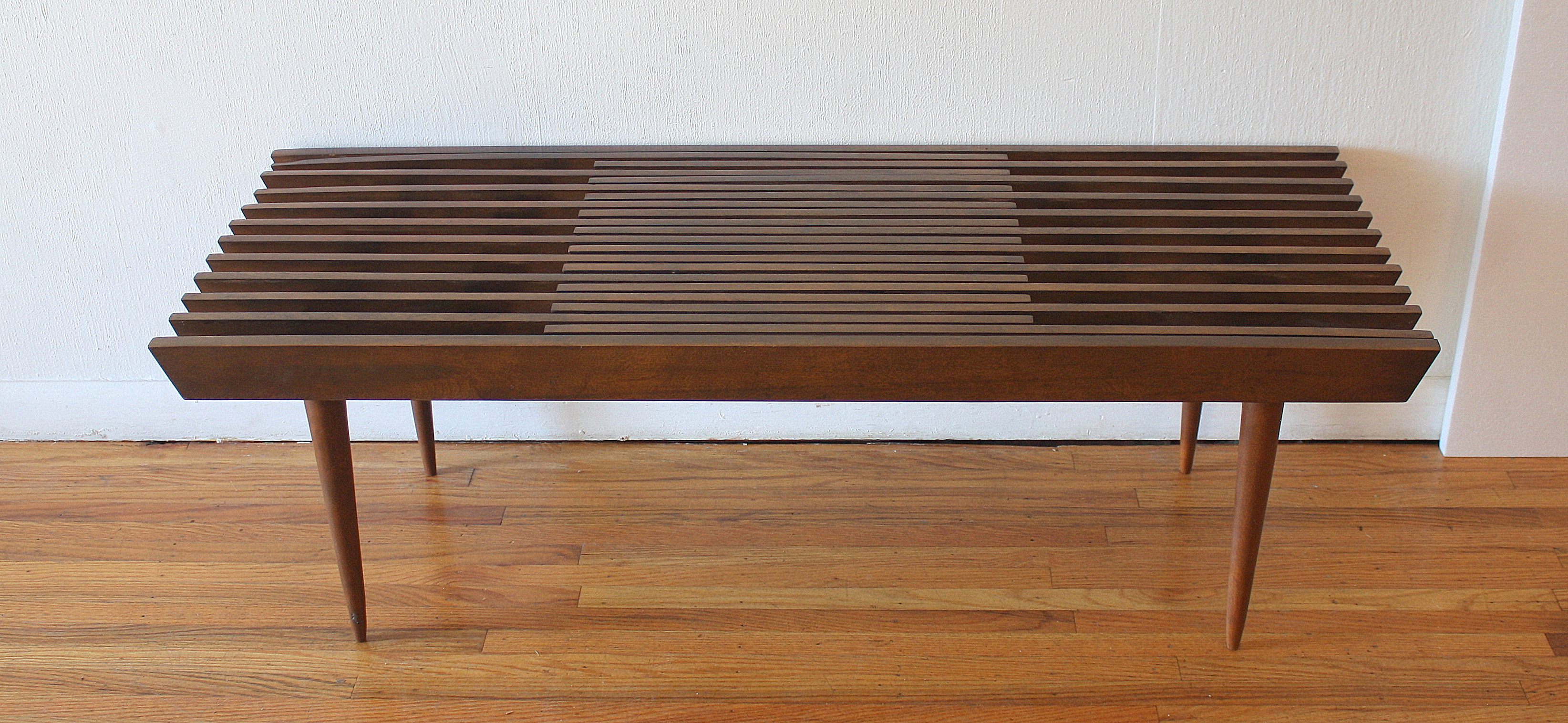 This is a mid century modern coffee slatted coffee table bench with an extending design and tapered legs. Dimensions:...
