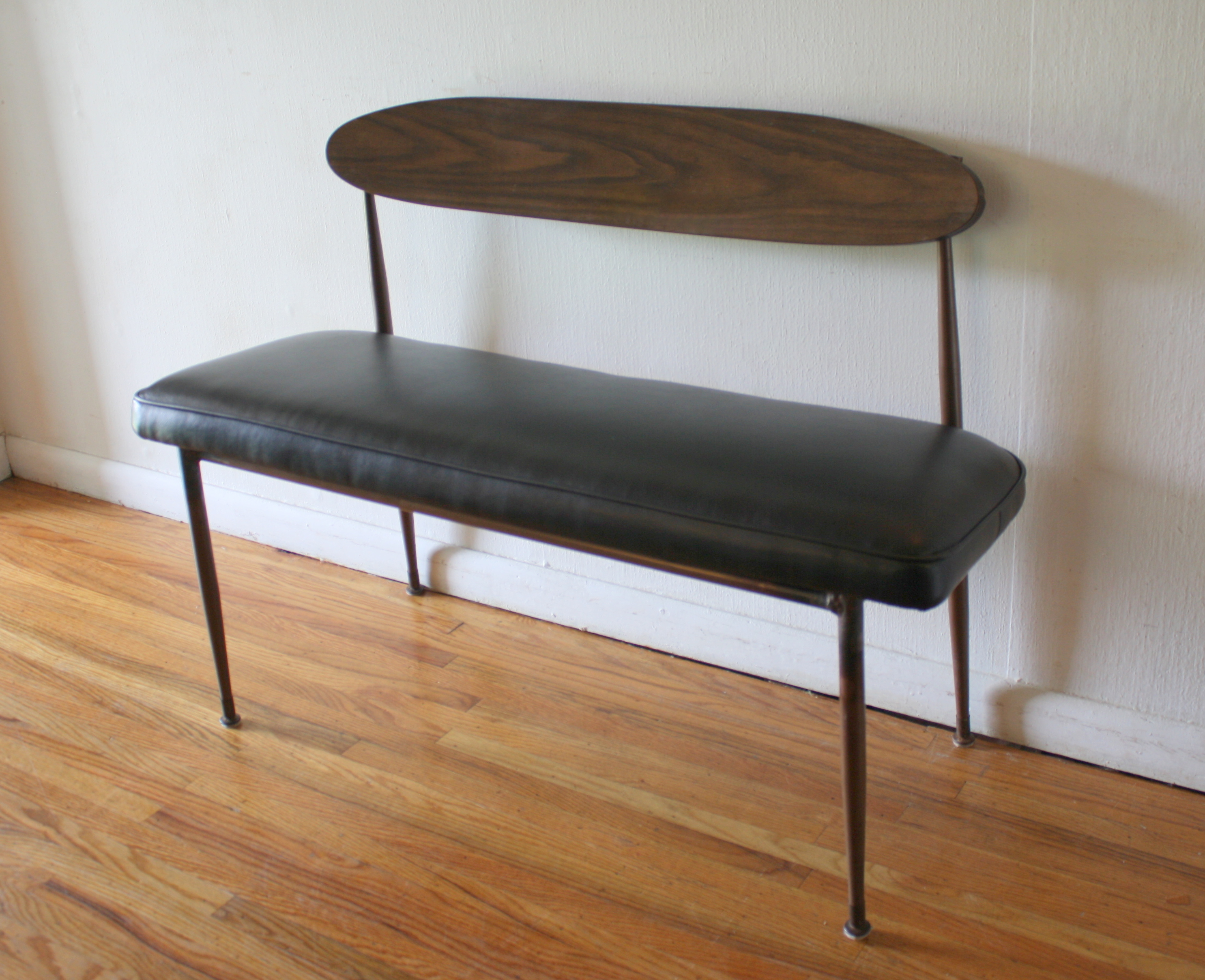 This is a mid century modern bench reupholstered with black naugahyde, with tapered metal legs and frame. Dimensions: 42″...