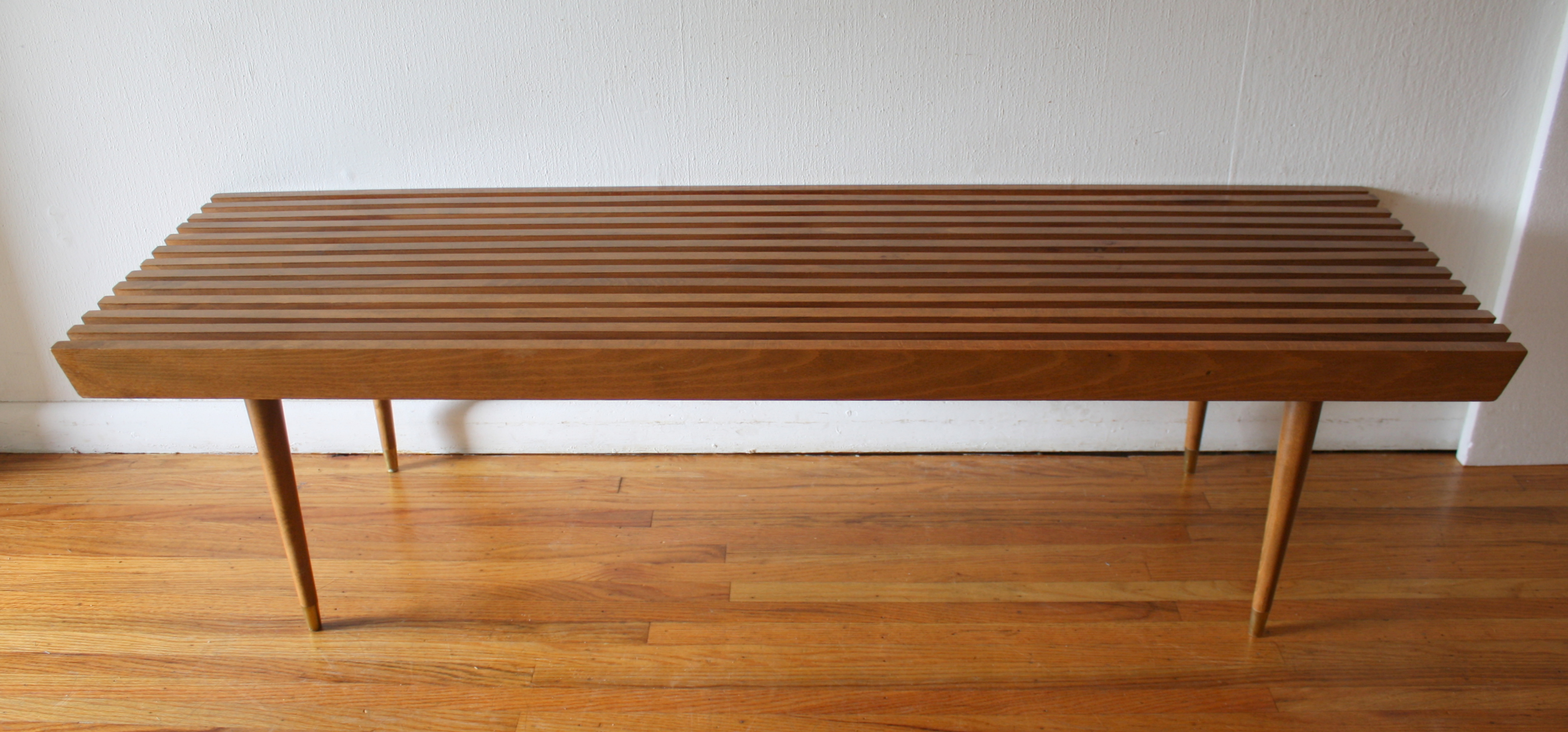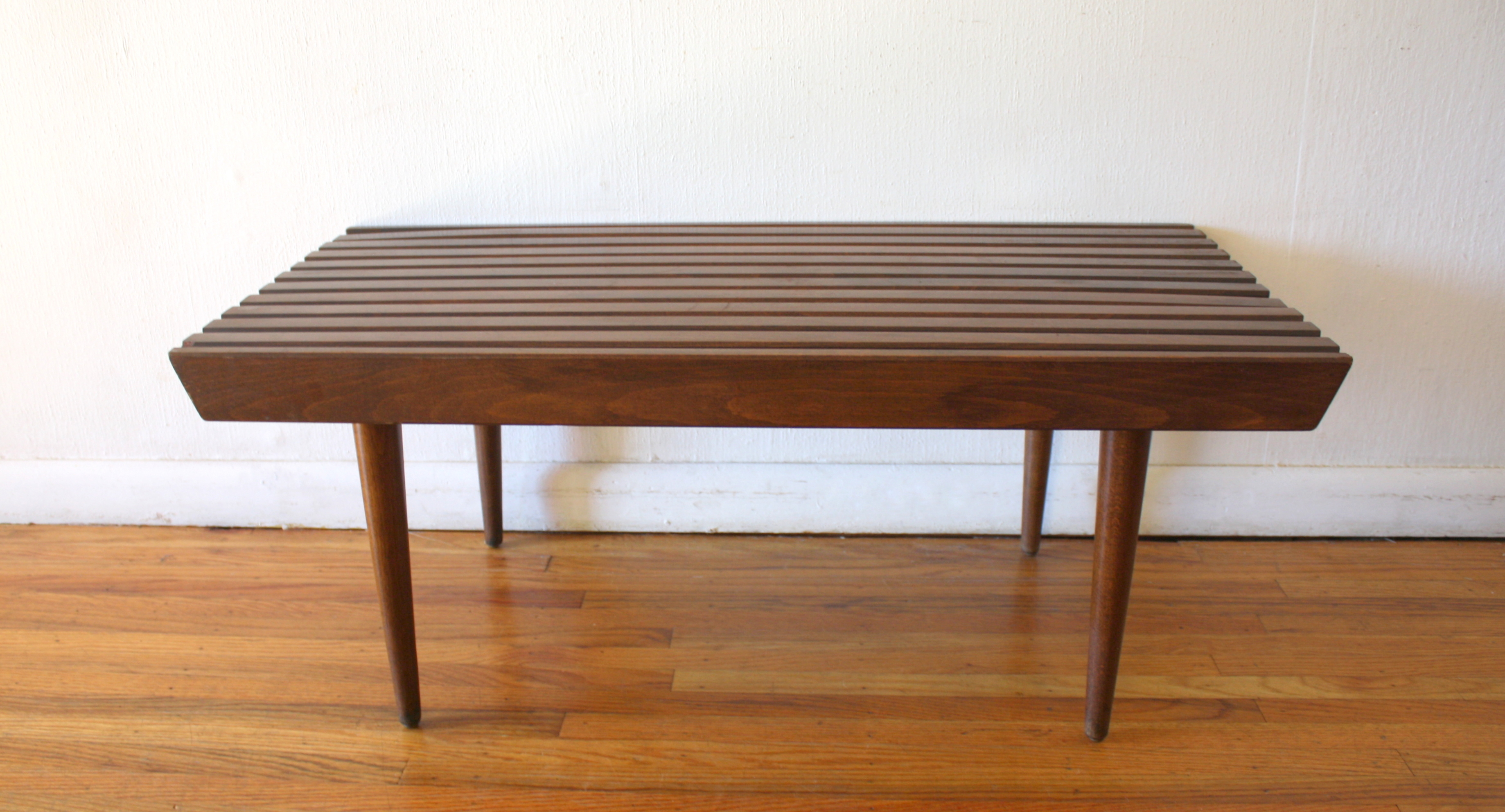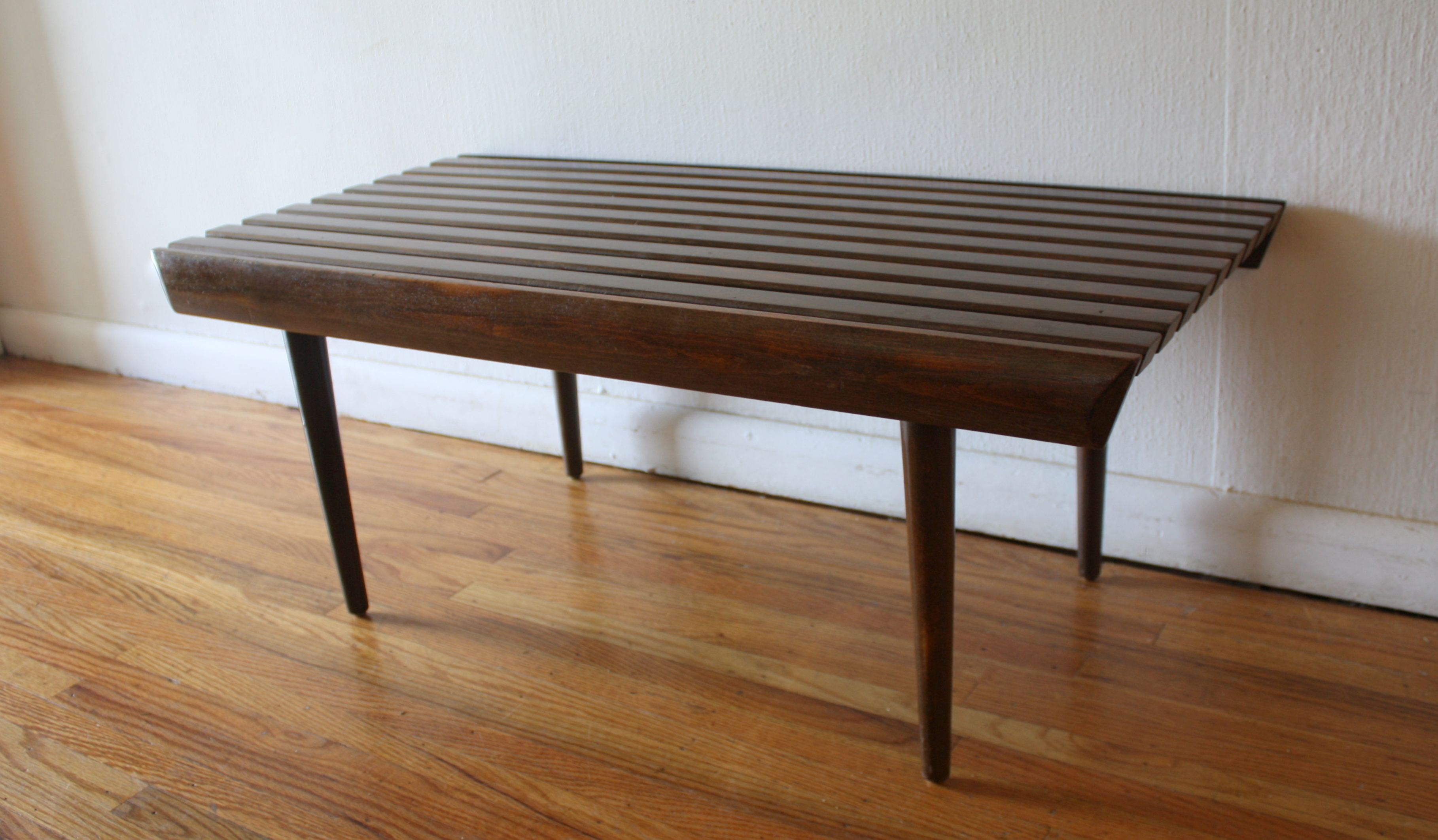 This is a mid century modern slatted coffee table bench. The first has a flat edge angled slatted design...