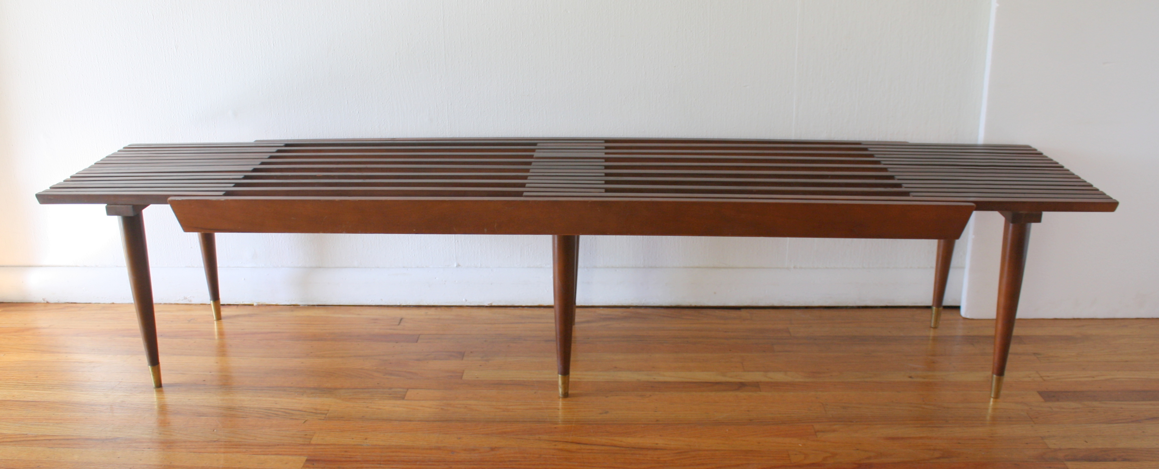 This is a mid century modern coffee table bench with a slatted design, brass tipped tapered legs, and a...