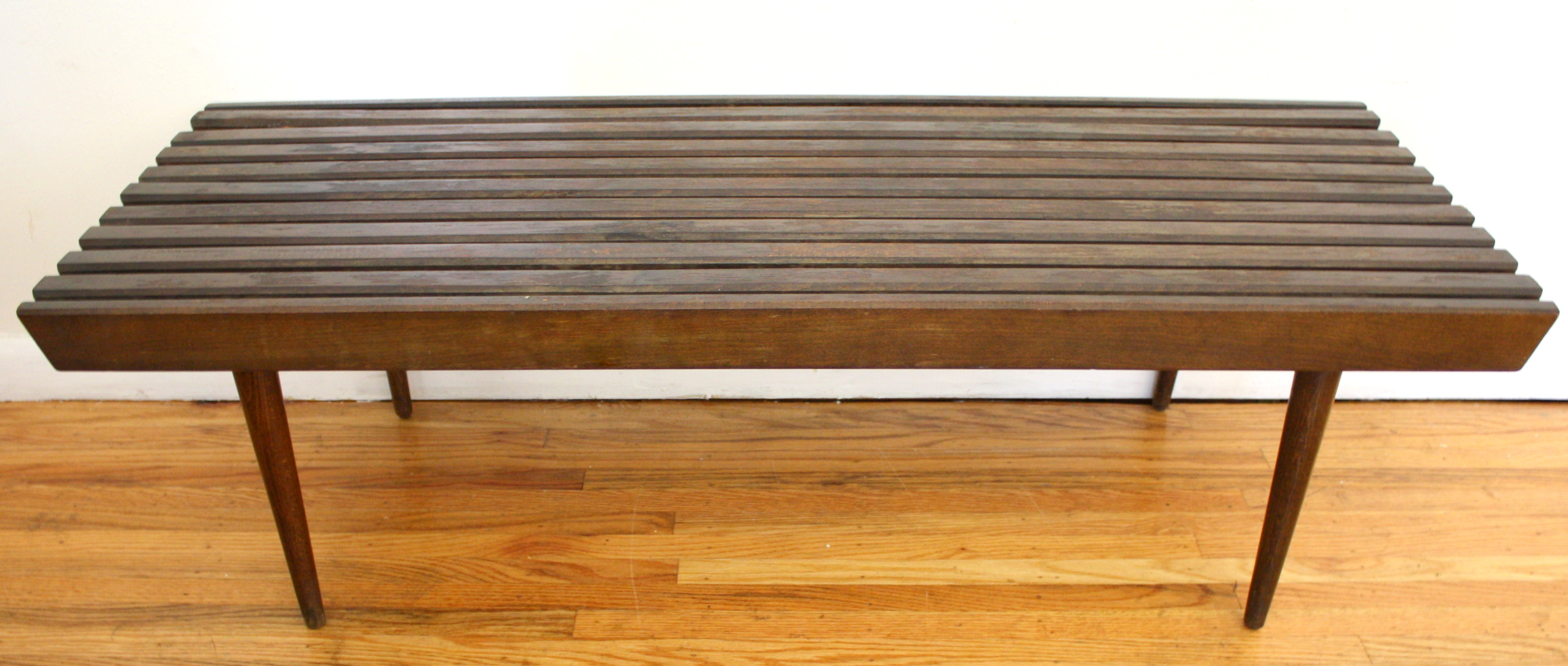 This is a mid century modern slatted bench made of solid wood. It has a rich espresso color, a...