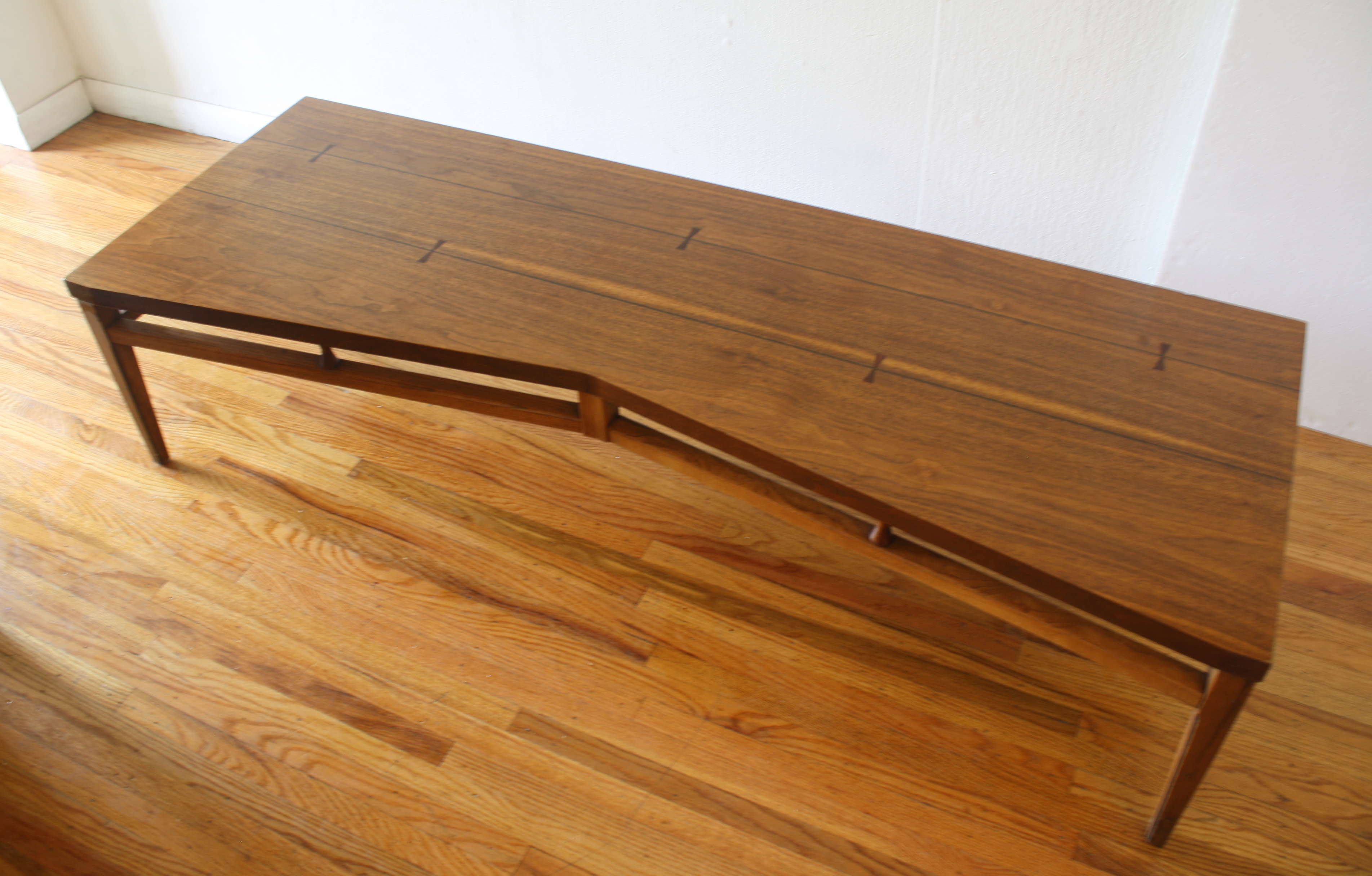This is a mid century modern slatted coffee table bench with an angled design and tapered legs. Dimensions: 36″W...