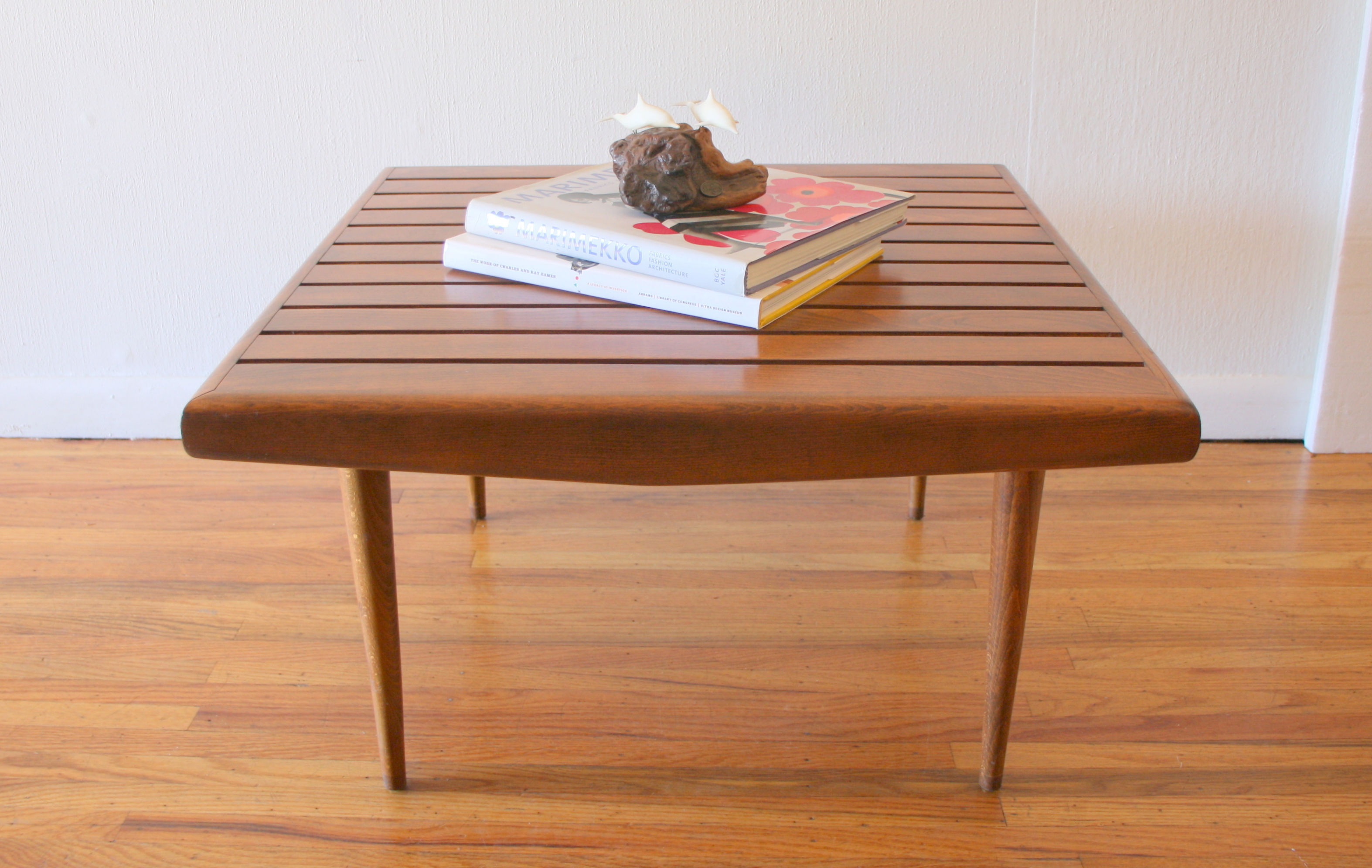 This is an Adrian Pearsall style mid century modern square slatted coffee table with tapered legs: 28″W x 28″D...