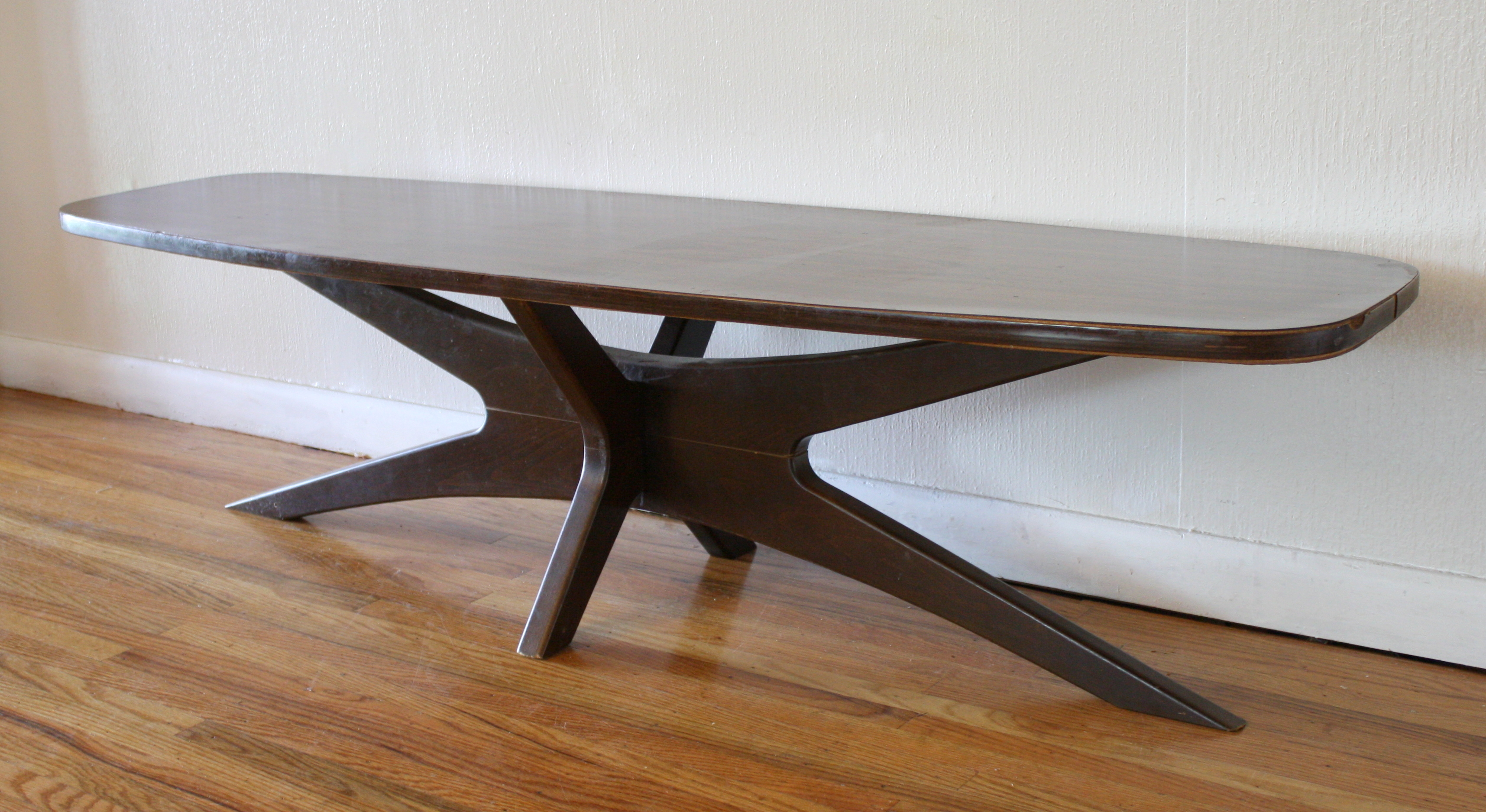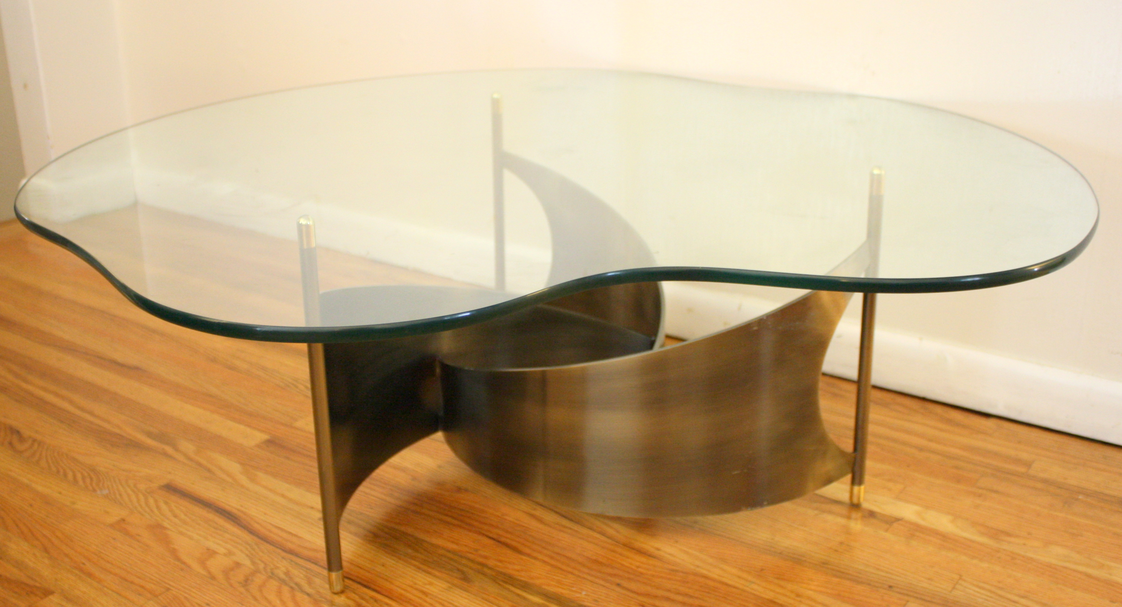 This is a mid century modern propeller style coffee table. It has a free form glass top and the...