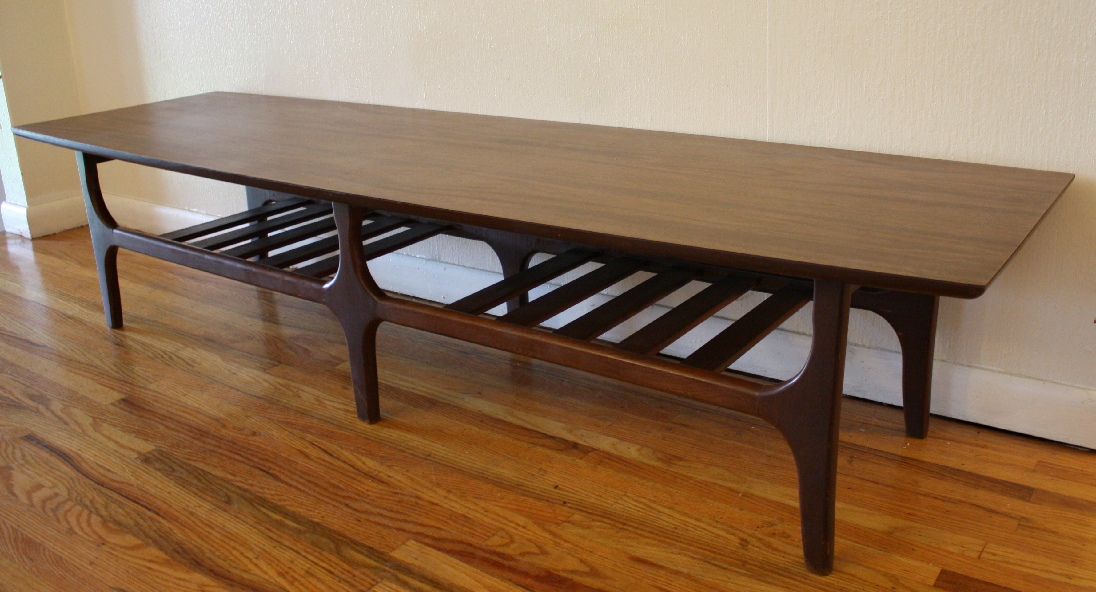 This is a mid century modern slatted bench made of solid wood. It has a rich espresso color, a...
