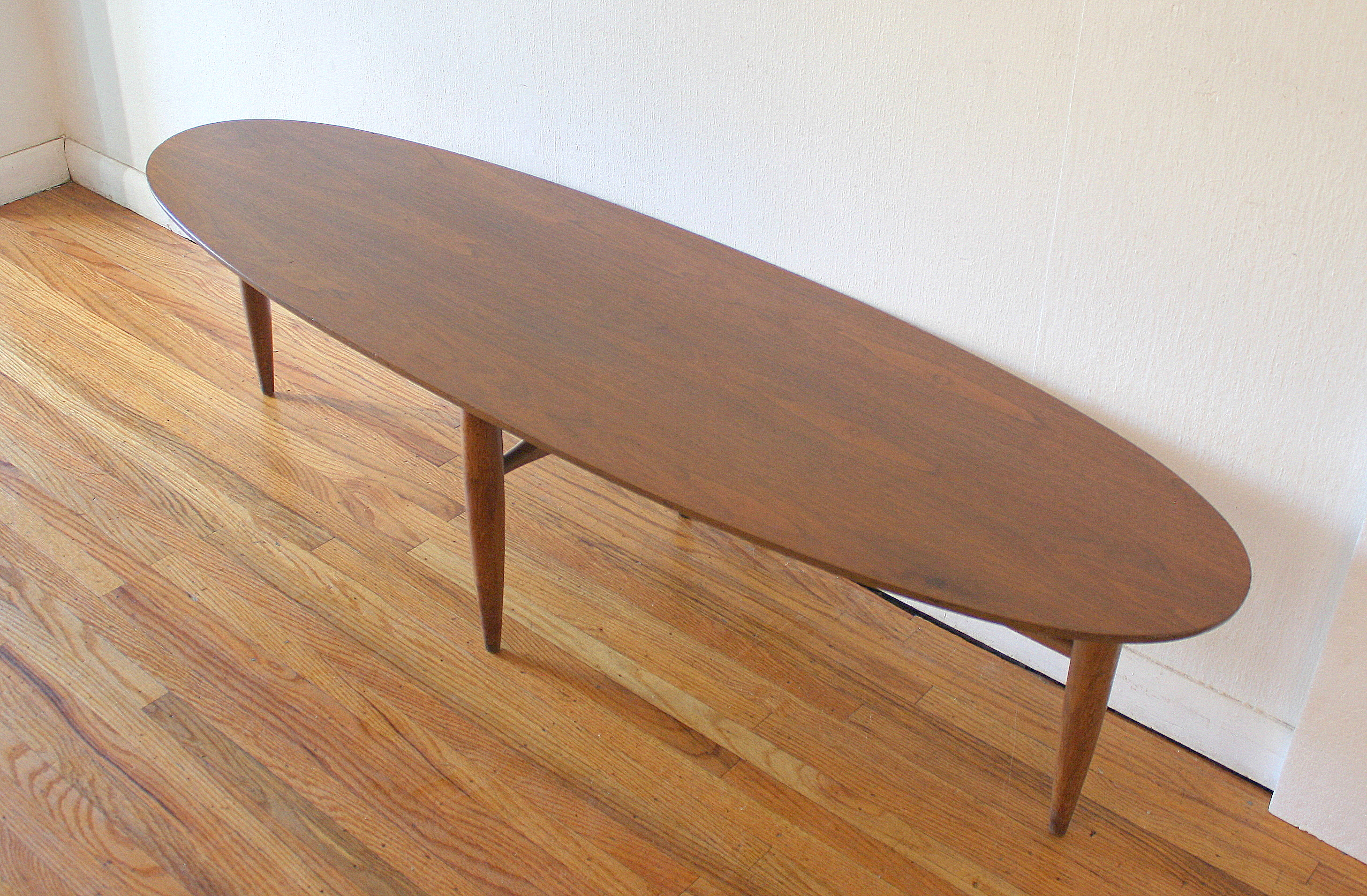 This is a mid century modern coffee table with a surfboard design, tapered legs, and beautiful wood grain. Dimensions: 50″W...
