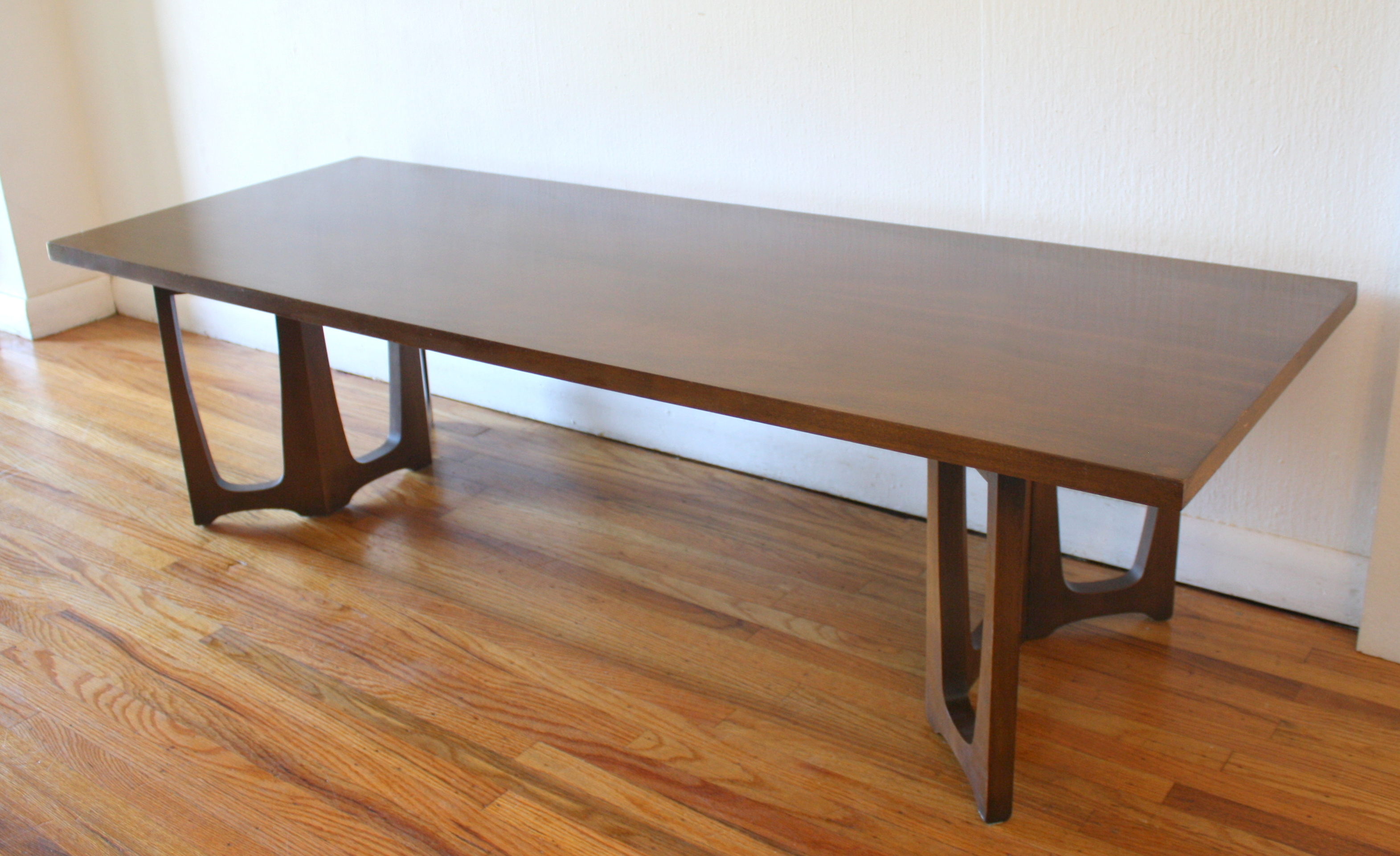 This is a mid century modern slatted coffee table bench with a beautiful curved undulating design and tapered legs. Dimensions: 60″W...