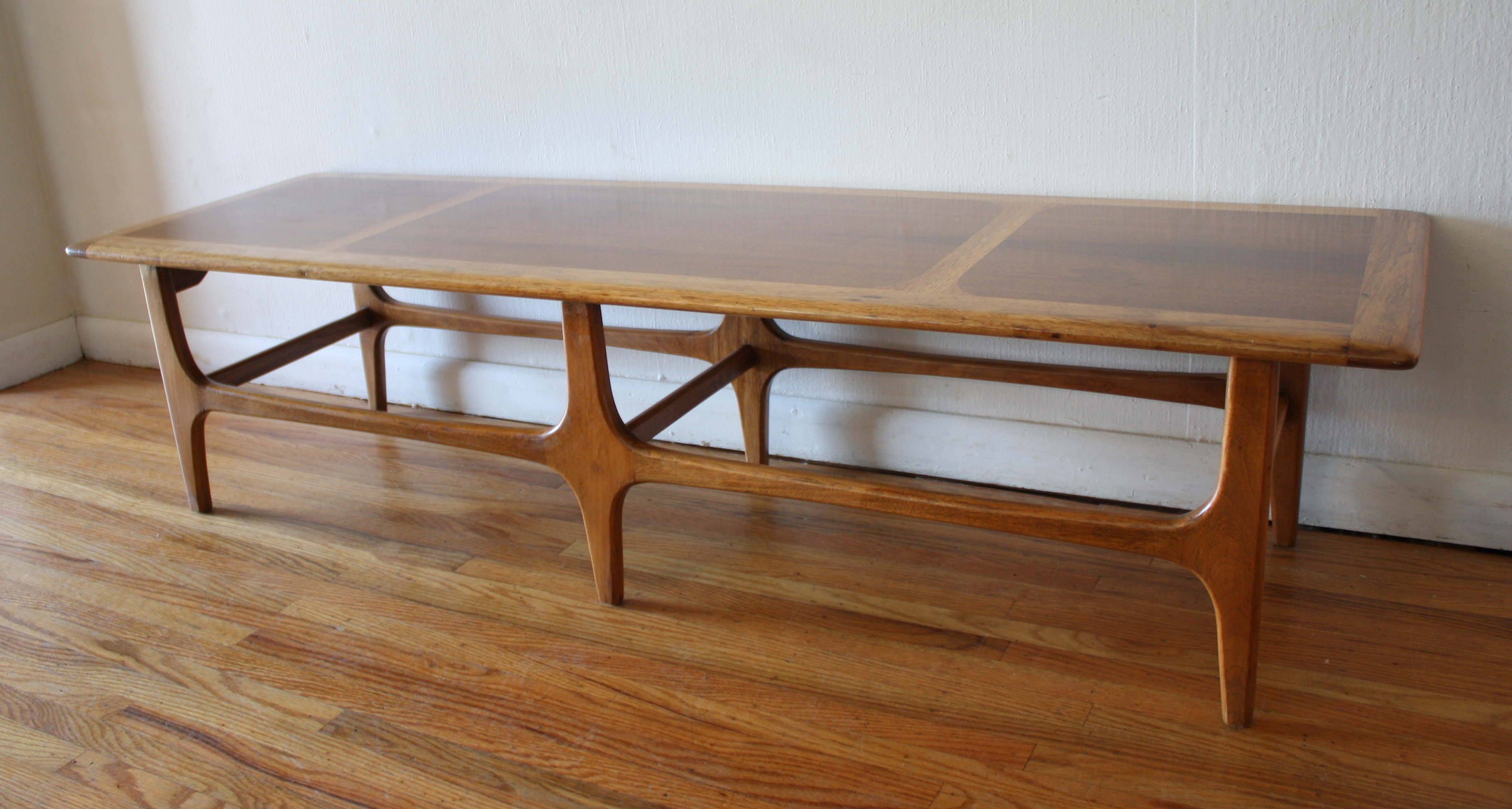 This is a mid century modern coffee table with surfboard edges, a bottom slatted shelf, and tapered legs. Dimensions: 54″W...