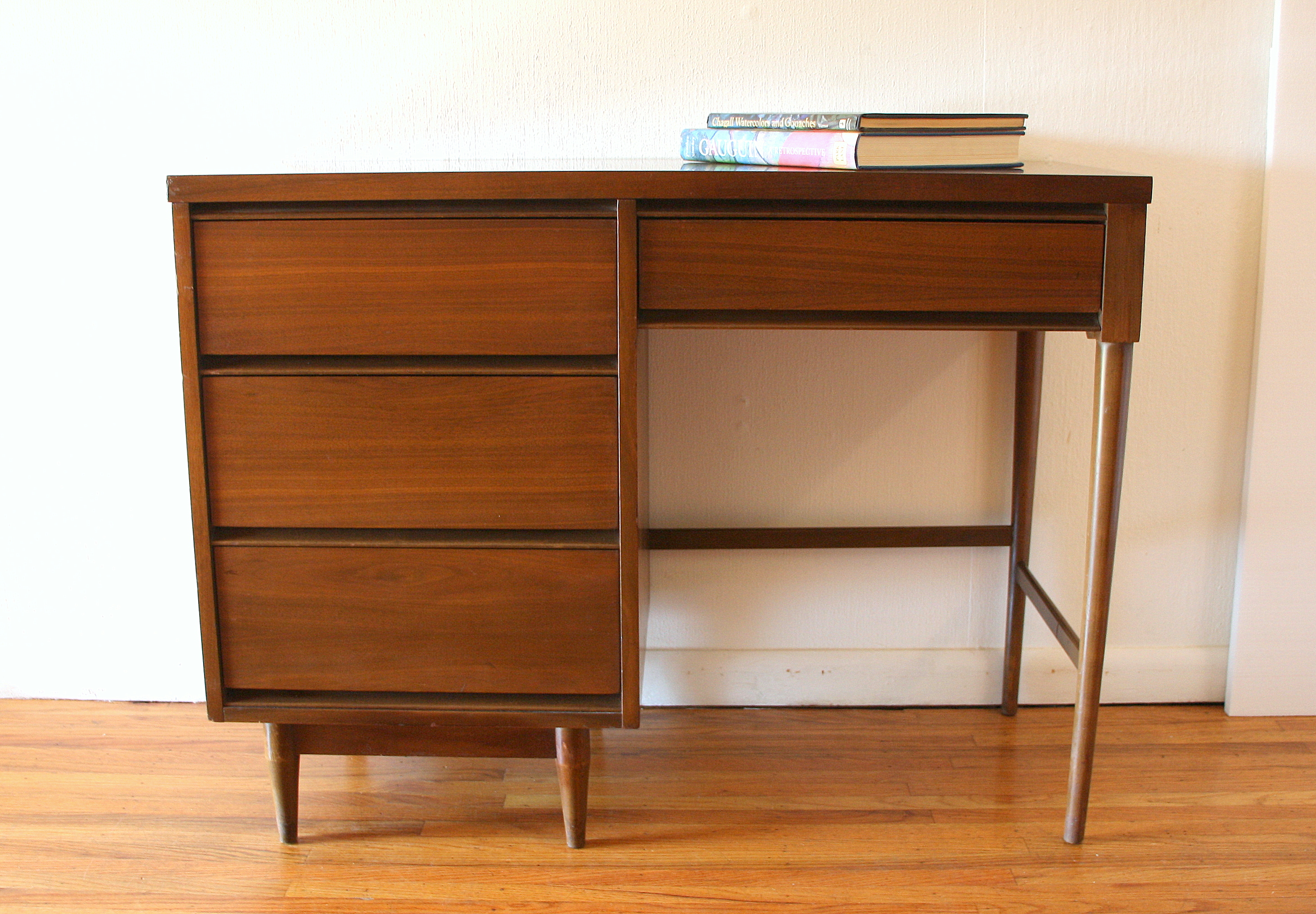 This is a mid century modern desk with 4 dovetailed drawers with a clean streamlined design and tapered legs. ...