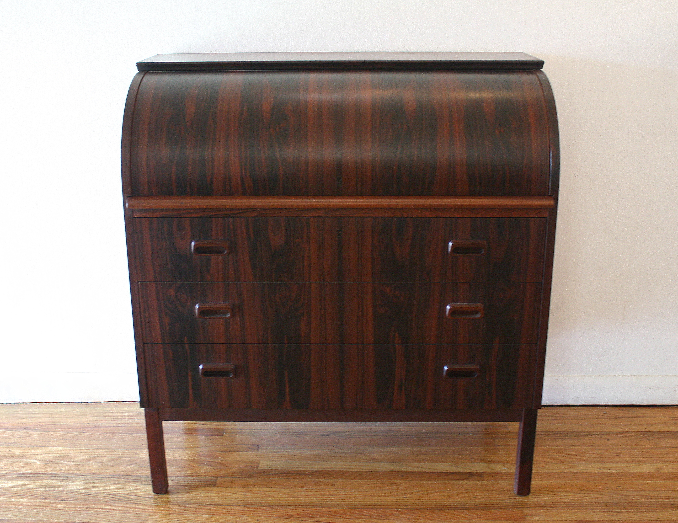 This is a mid century modern rosewood secretary desk, made in Sweden. It has three dovetailed drawers with carved...