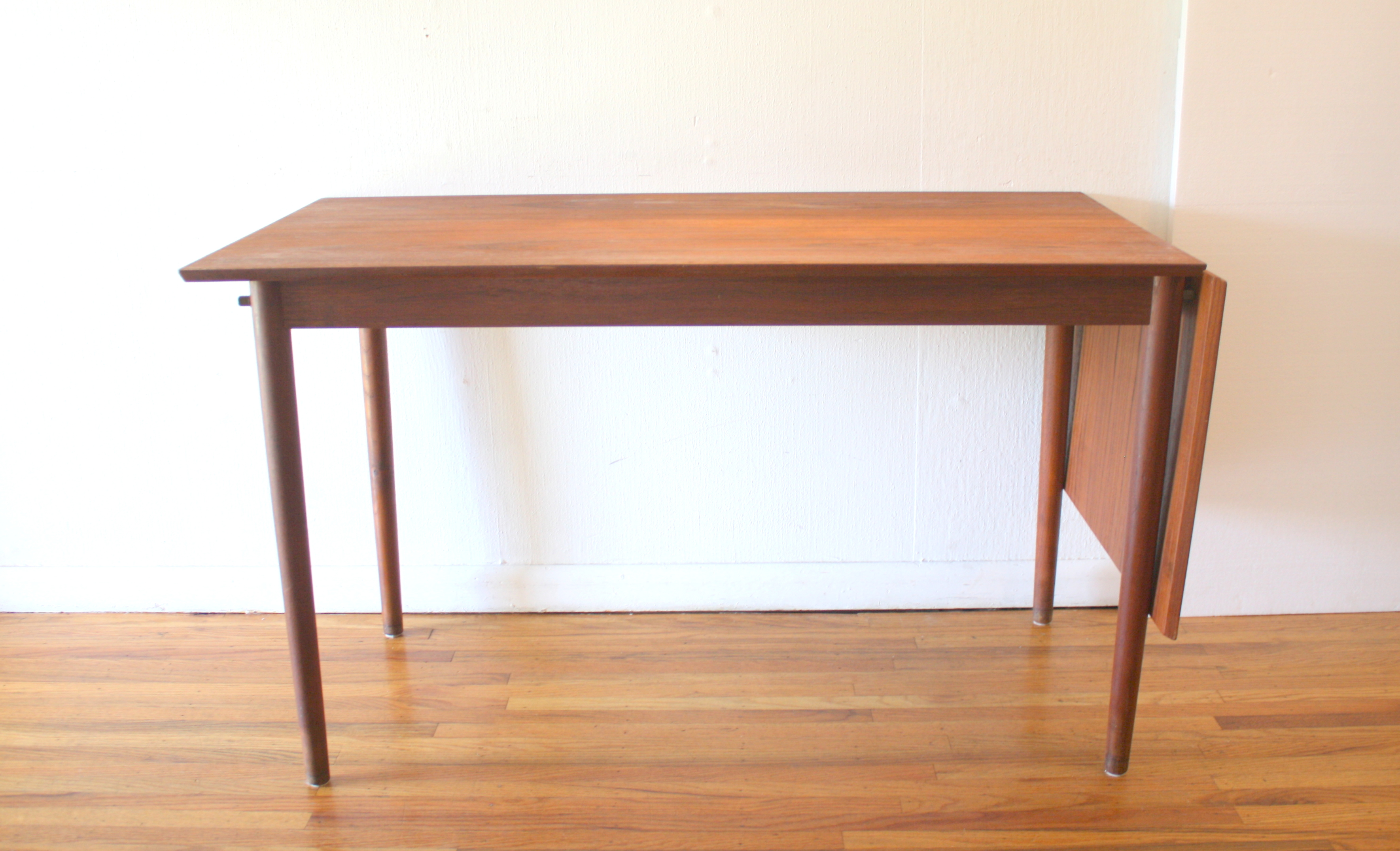 This is a mid century modern Danish teak desk that has a drop leaf that pops up from vertical...