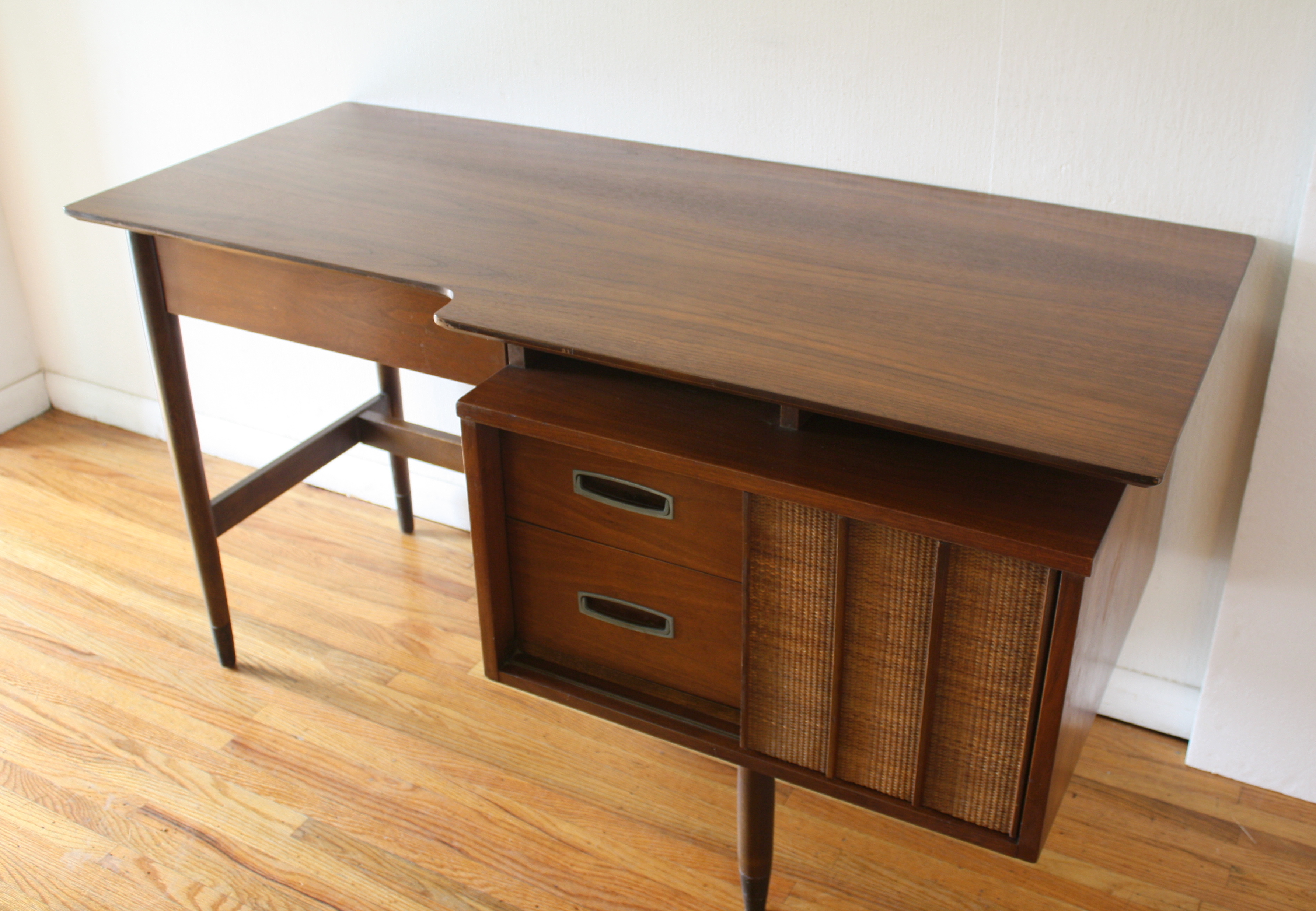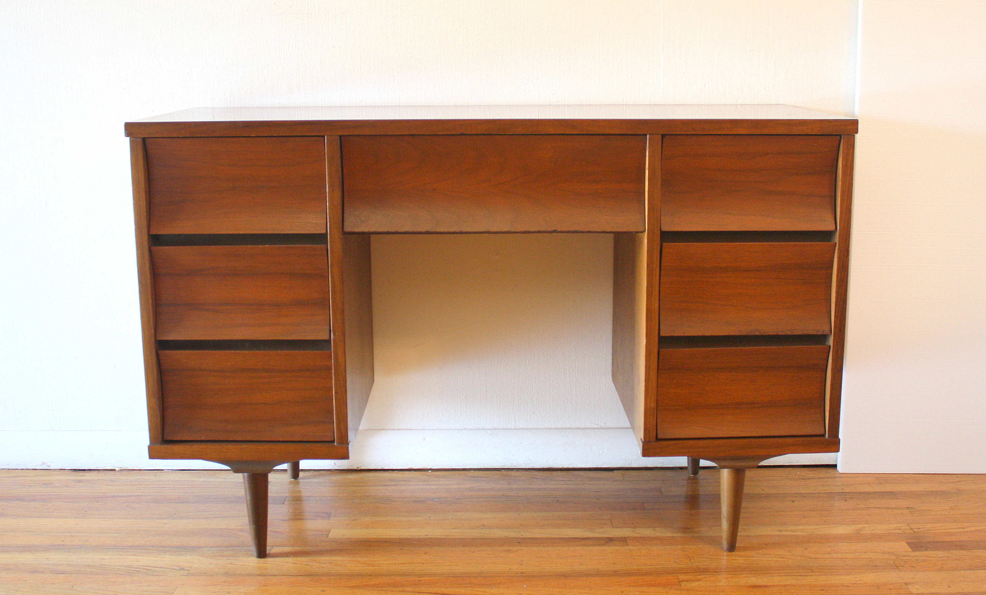 This is a mid century modern desk by Bassett. It has their signature surfboard edge, and 3 dovetailed drawers...