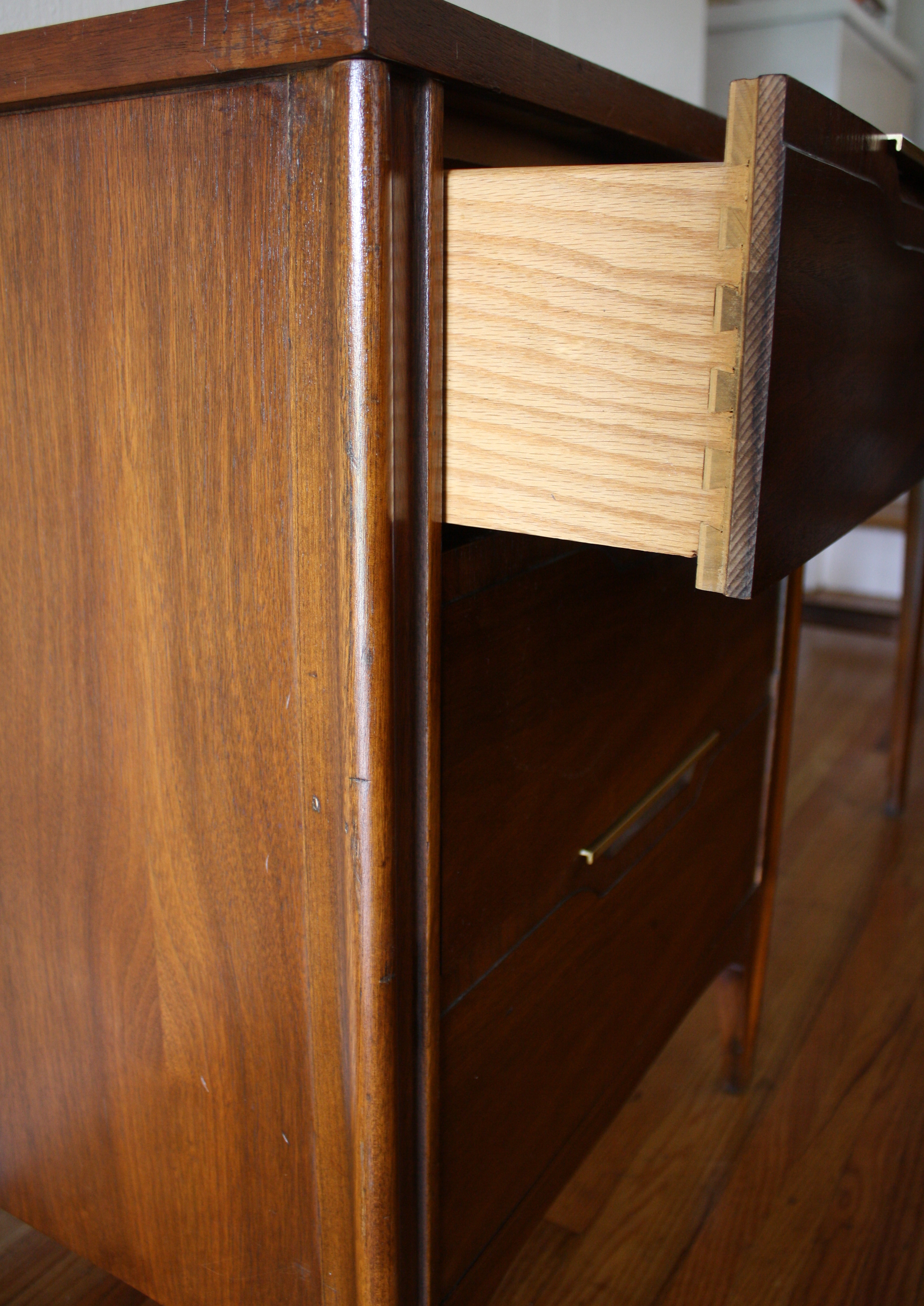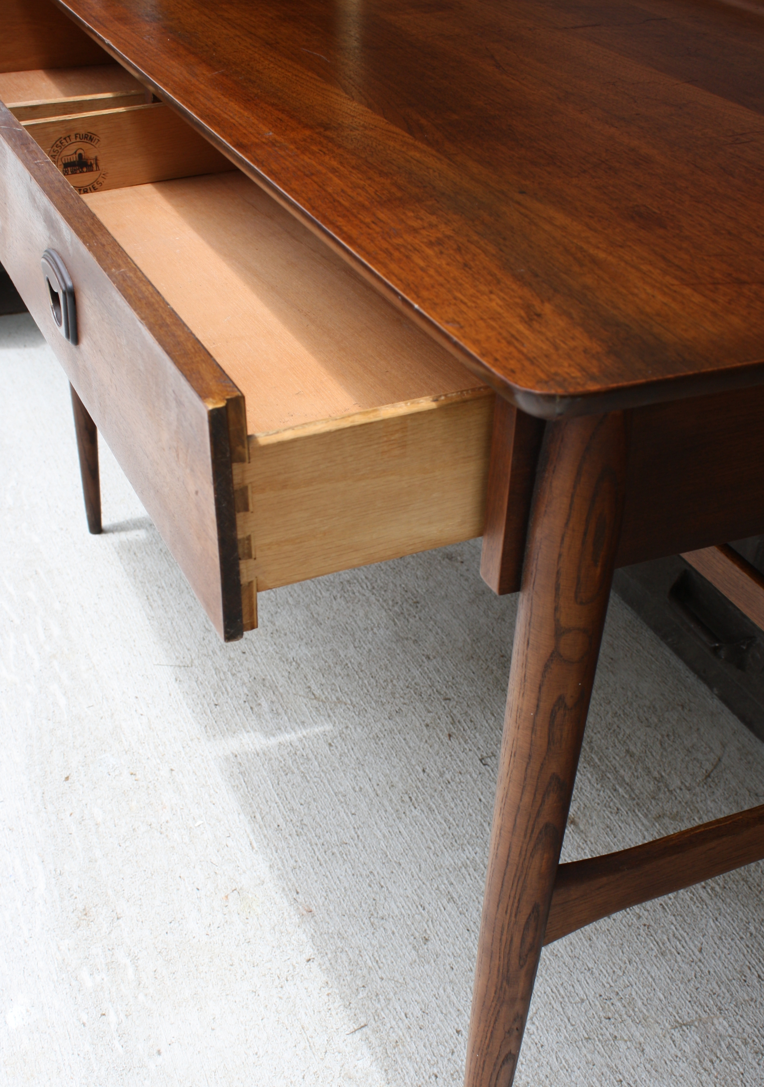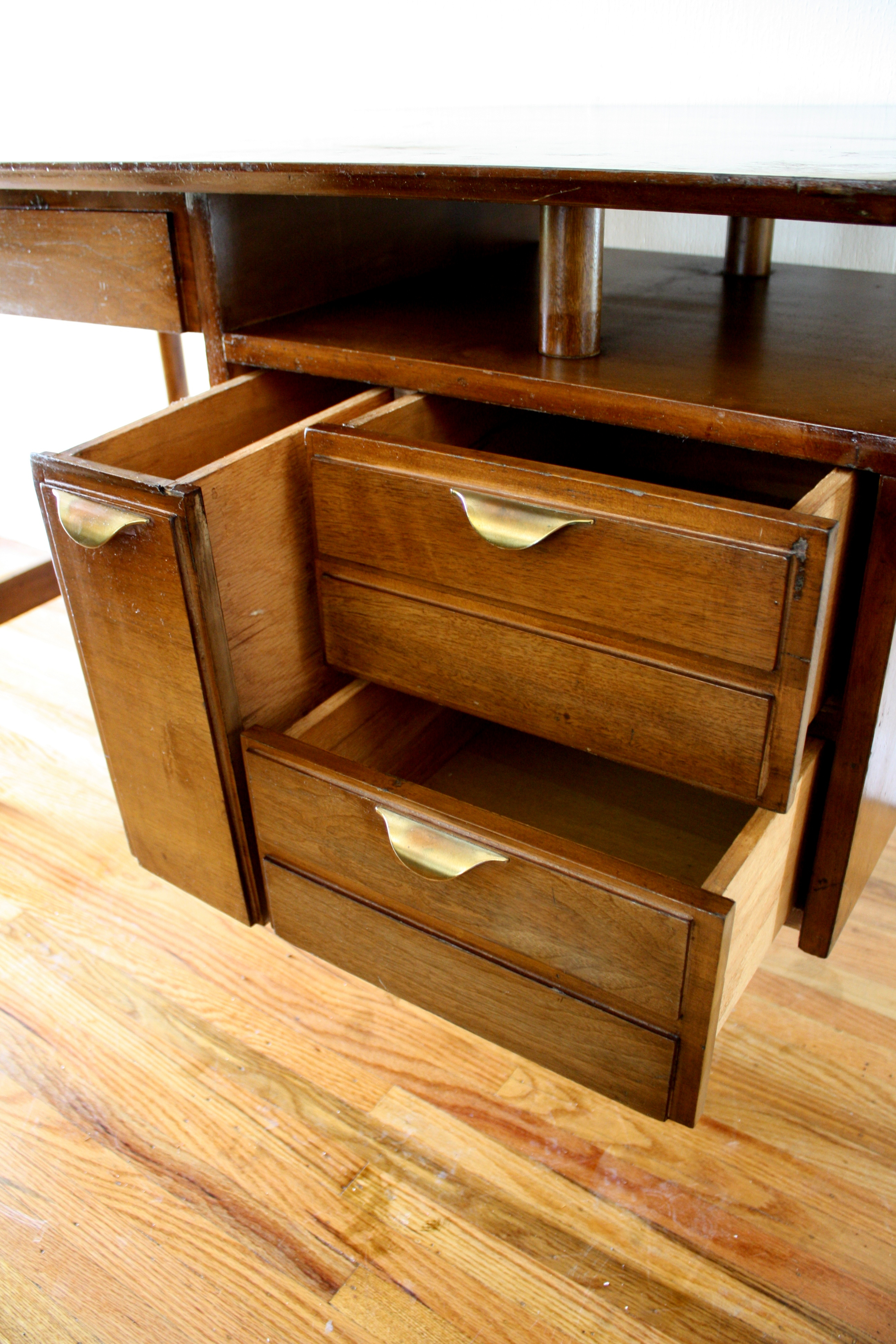 This is a mid century modern desk by Bassett. It is made of solid walnut, has a great surfboard...