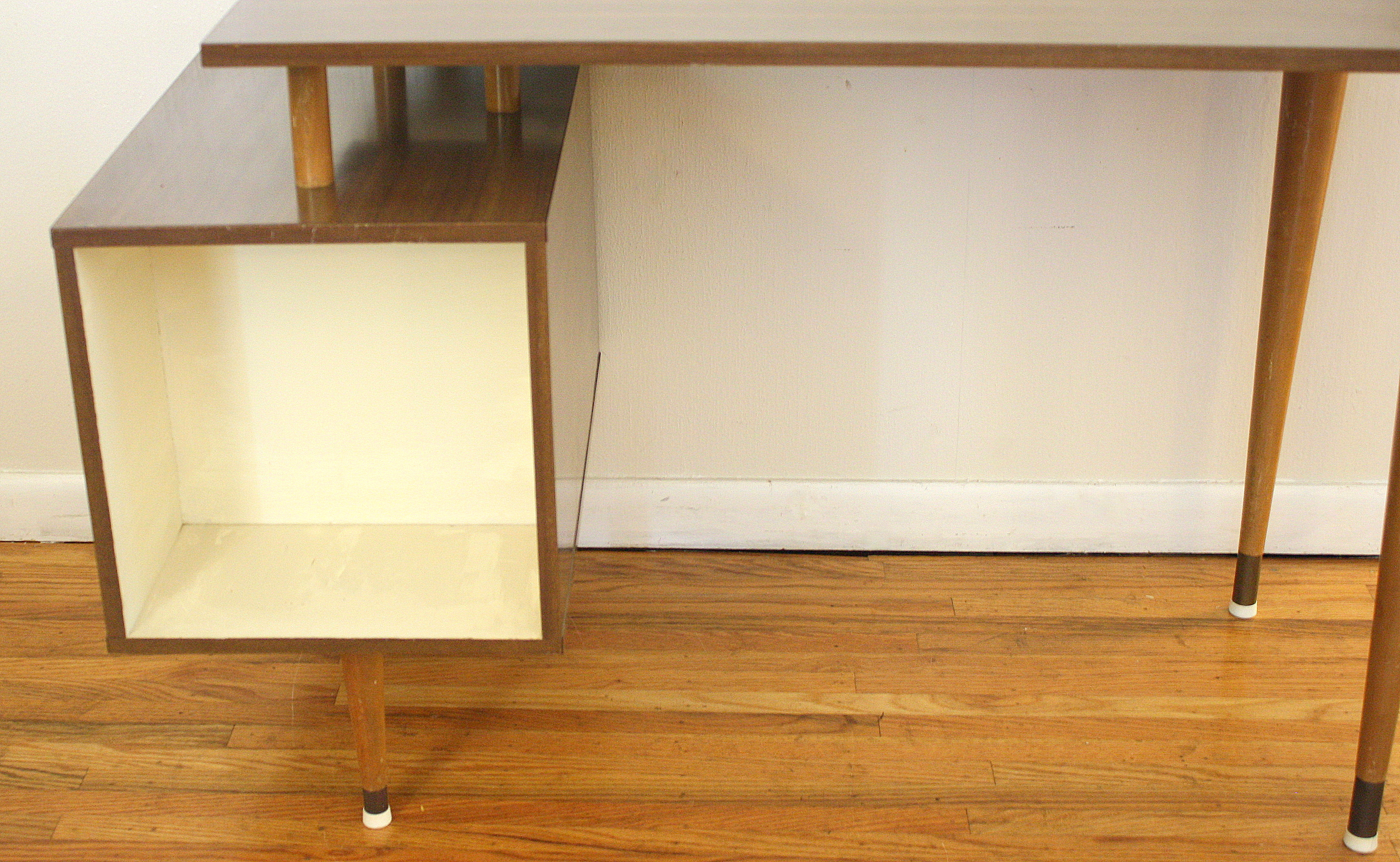 This is a mid century modern floating desk finished in formica. It has the signature mcm tapered legs, floating...