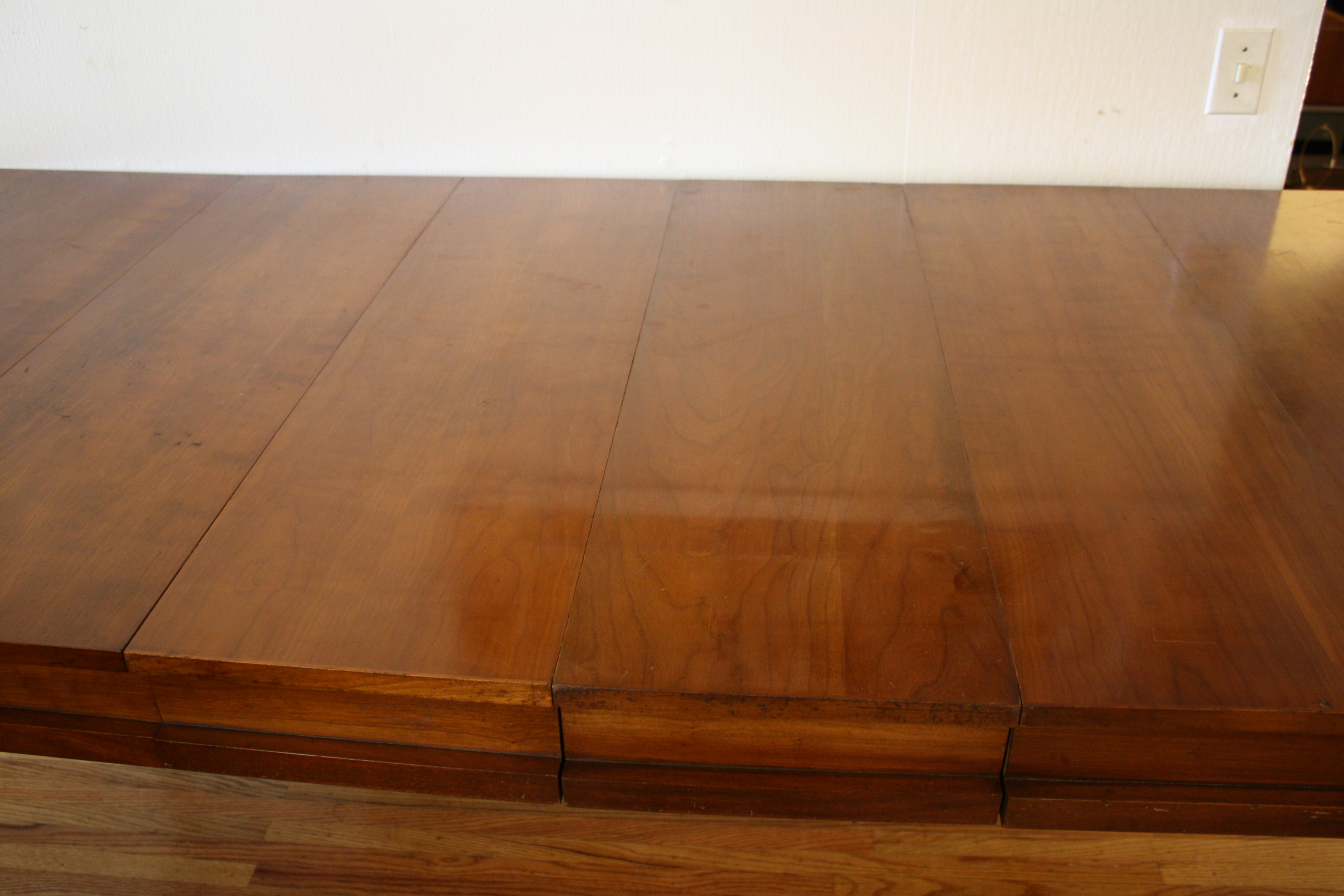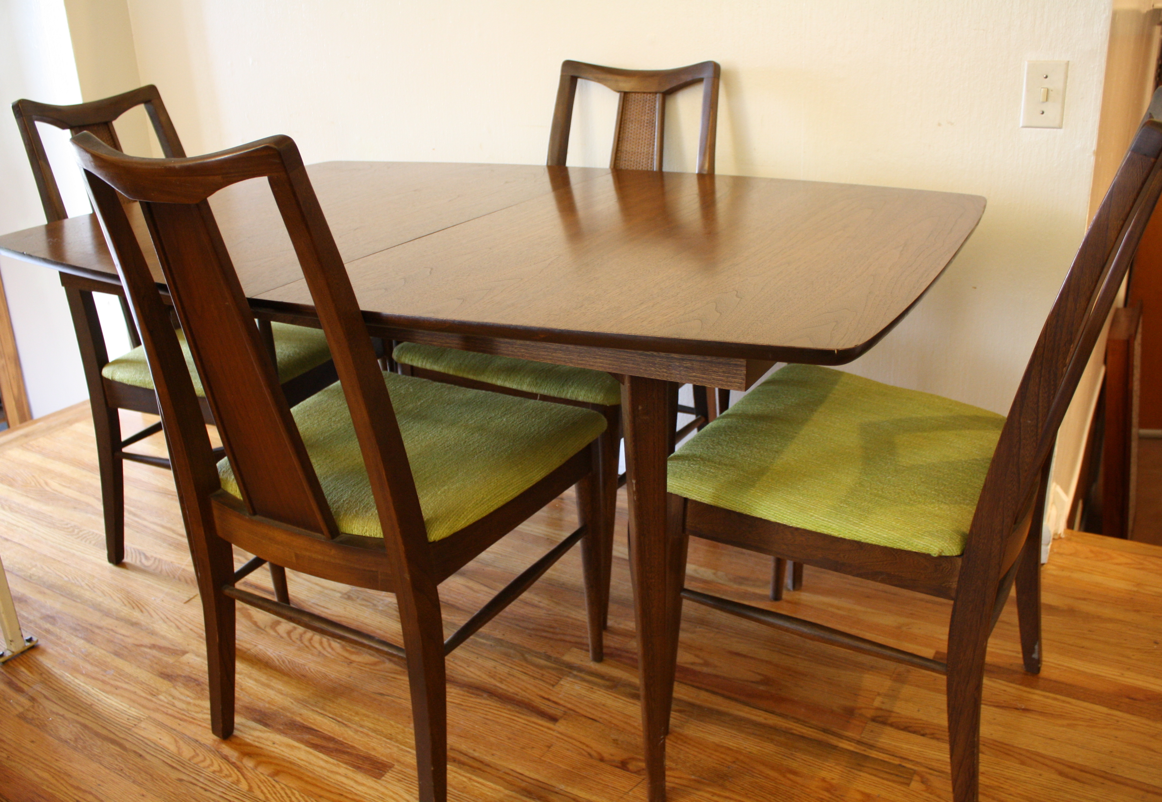This is a mid century modern dining set from American by Martinsville. The table is made of solid walnut,...