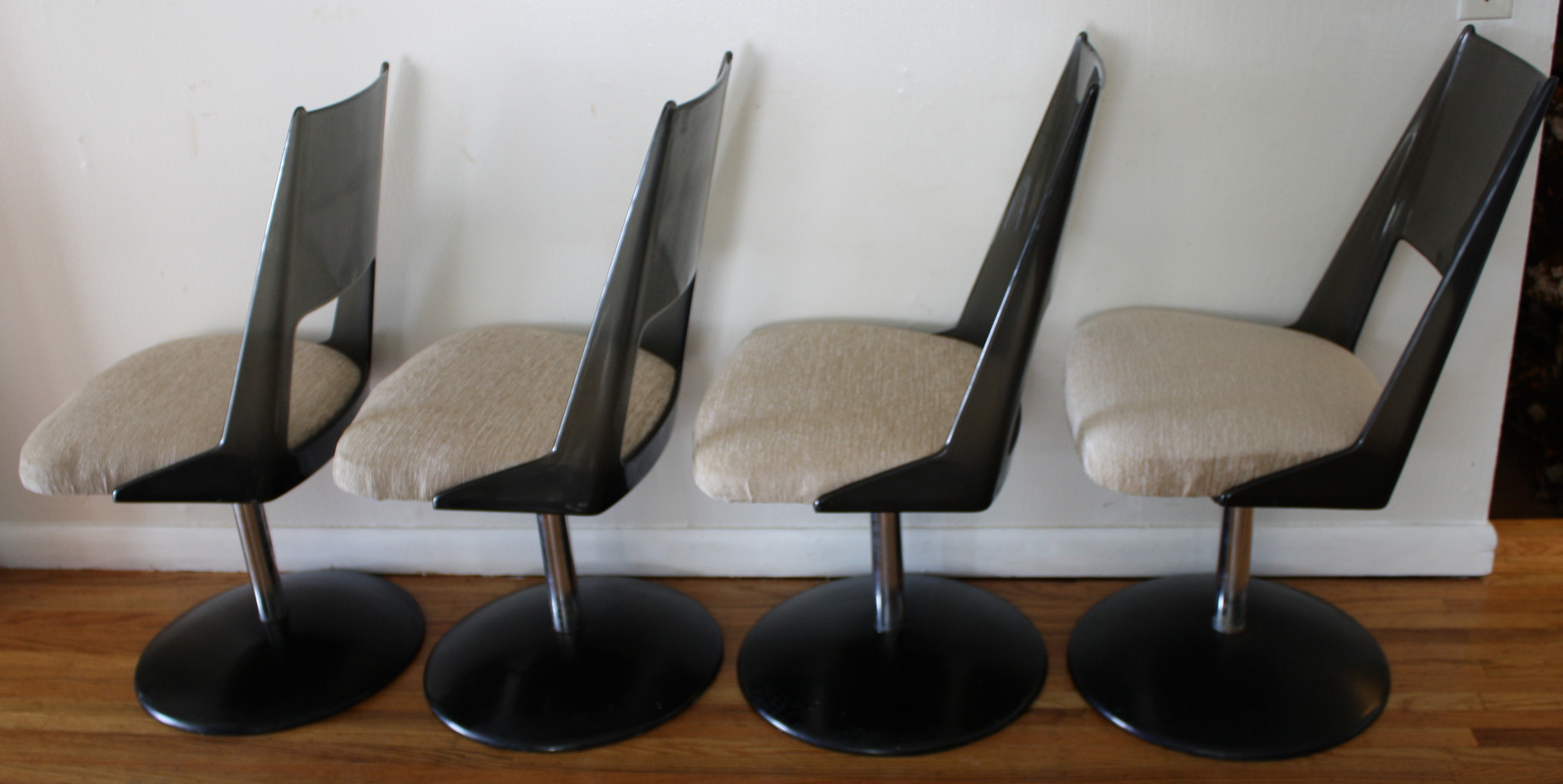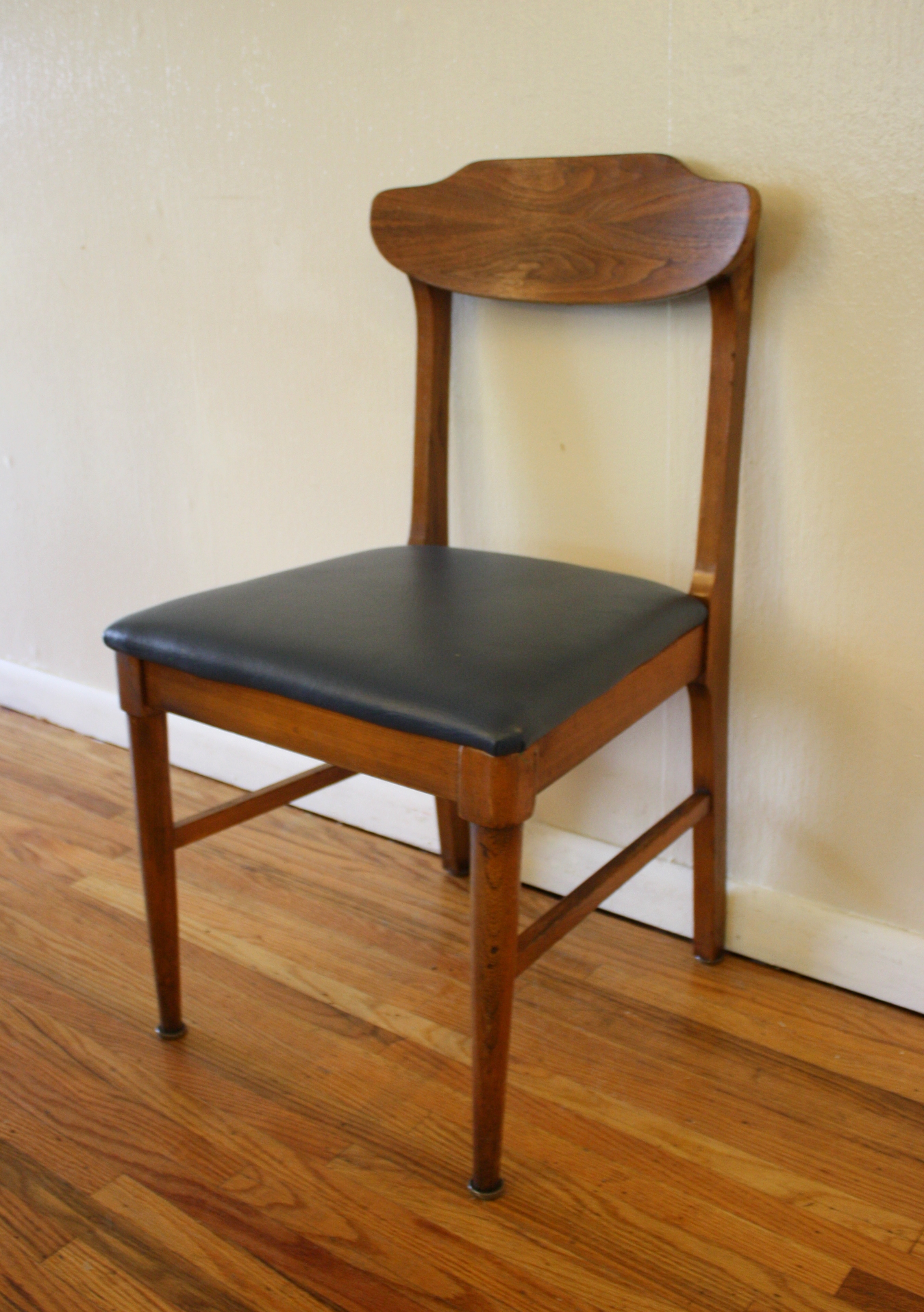 These are 4 mid century modern chairs with upholstered seats. Each chair has a solid wood base, tapered legs,...