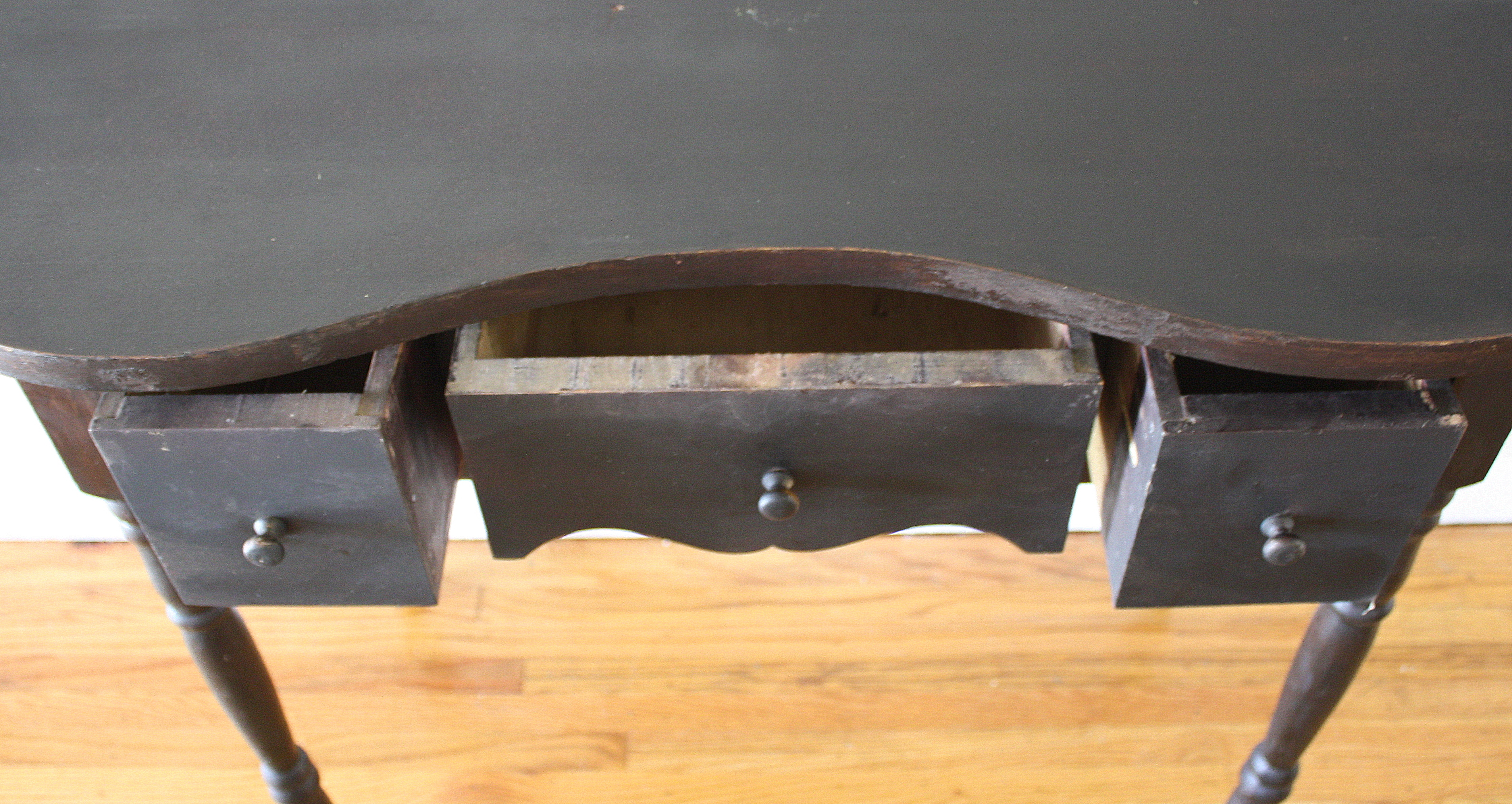 This is an antique vanity console table refinished in a matte black. It is made of solid wood, has...