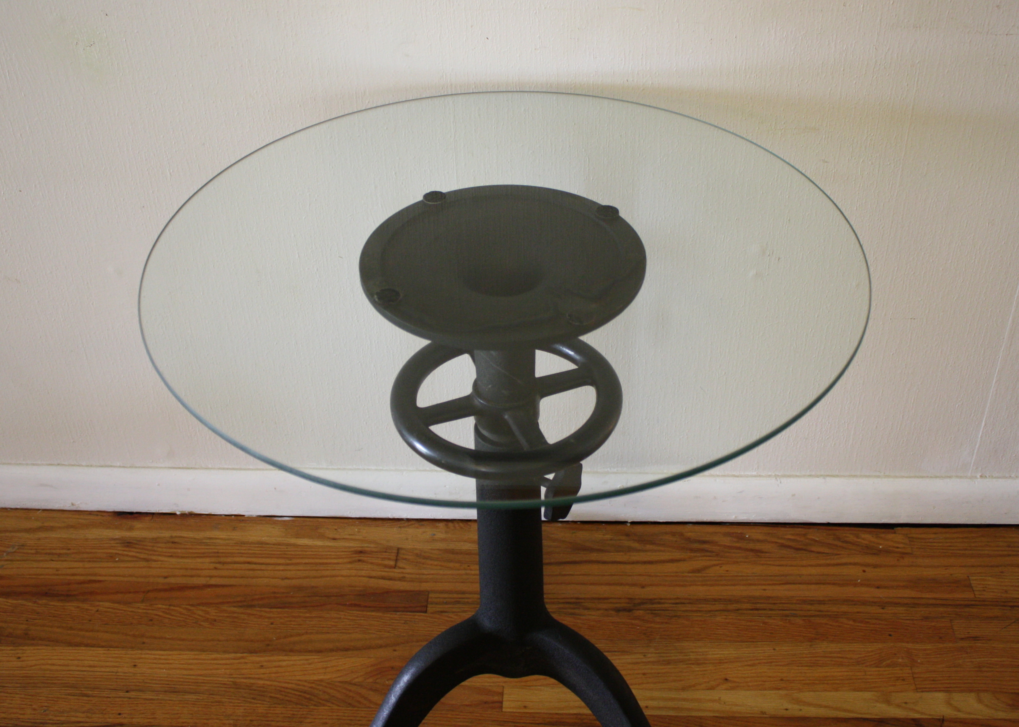 This is an antique cast iron table with a beautiful industrial design. It has a heavy cast iron base...