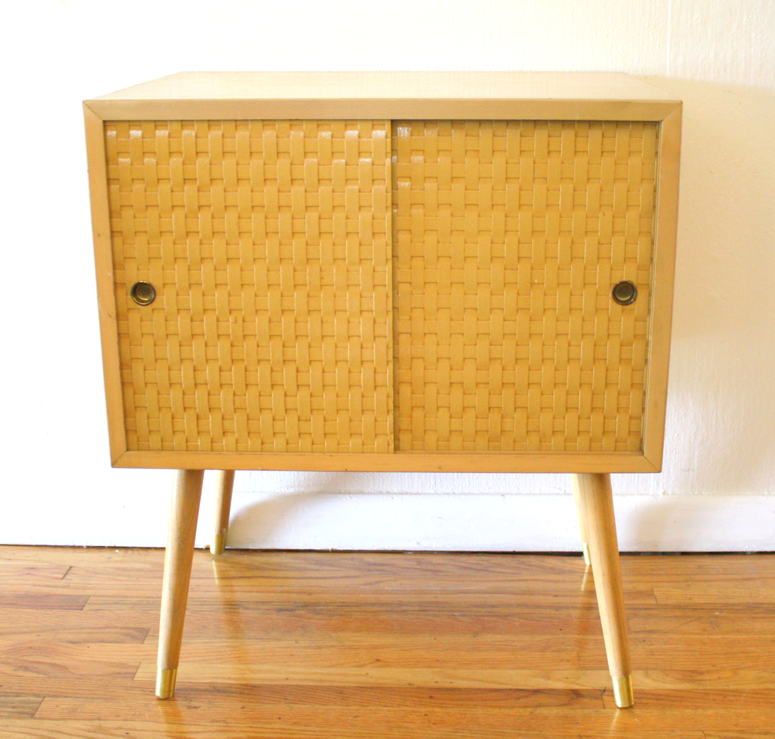 This is a mid modern side table with basket weave sliding doors. It has the signature mcm legs and...