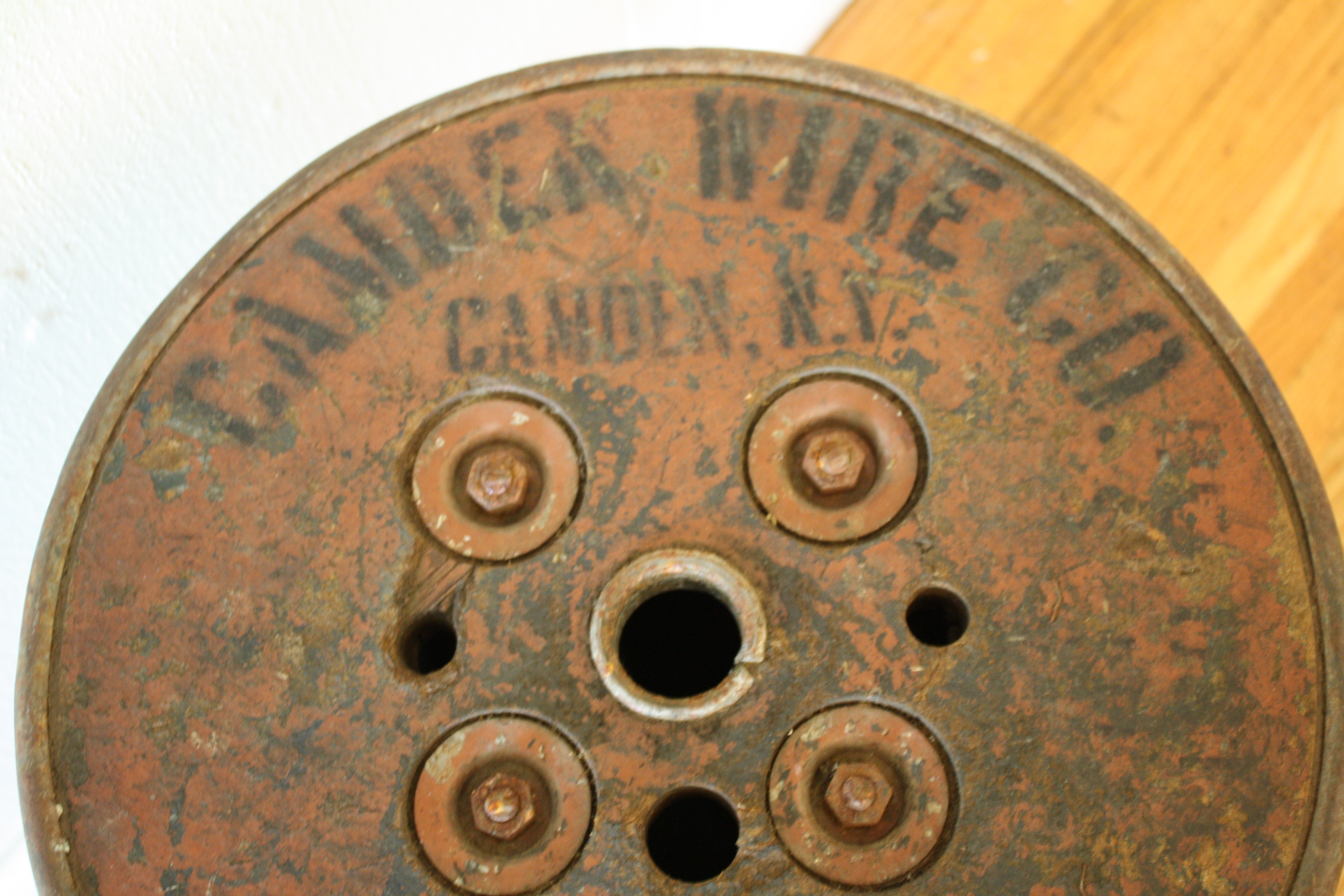 This is an antique industrial spool table from the Camden Wire Co. in New York. This side table is...