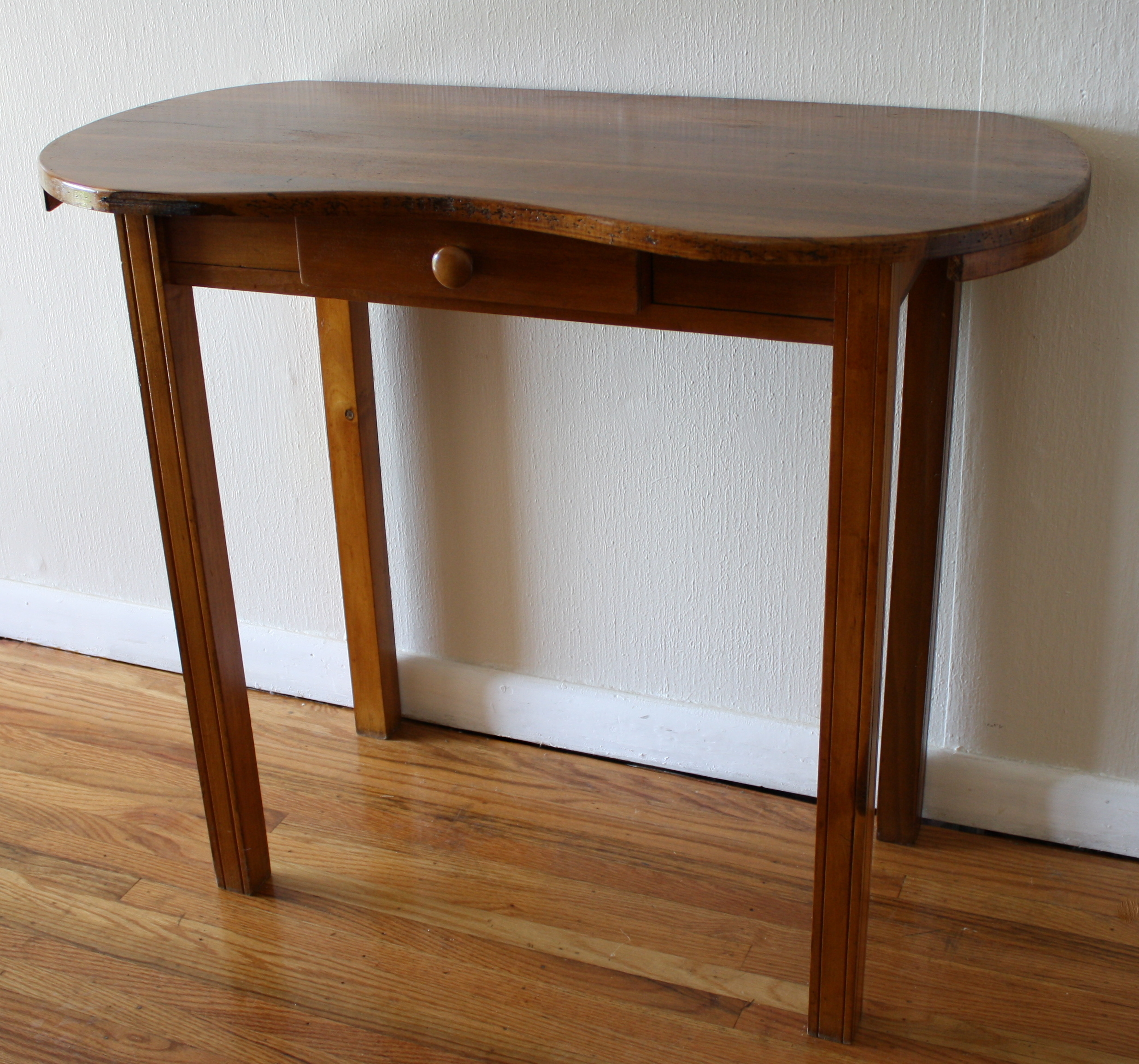 This is a petite antique kidney table made of solid wood. It can be used as a vanity, console...