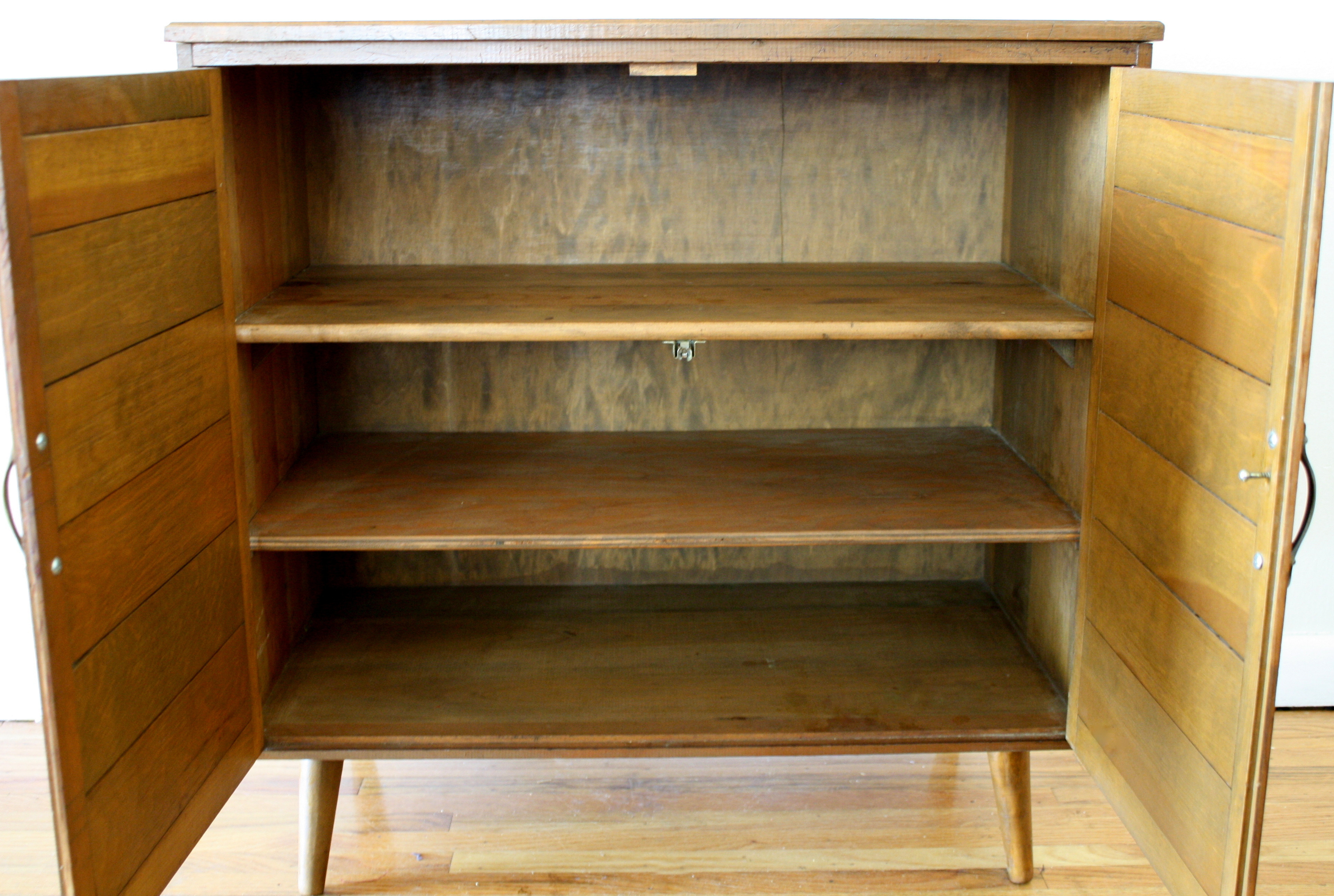 This is a mid century modern slatted server cabinet made of solid wood. It has solid wood shelves, tapered...