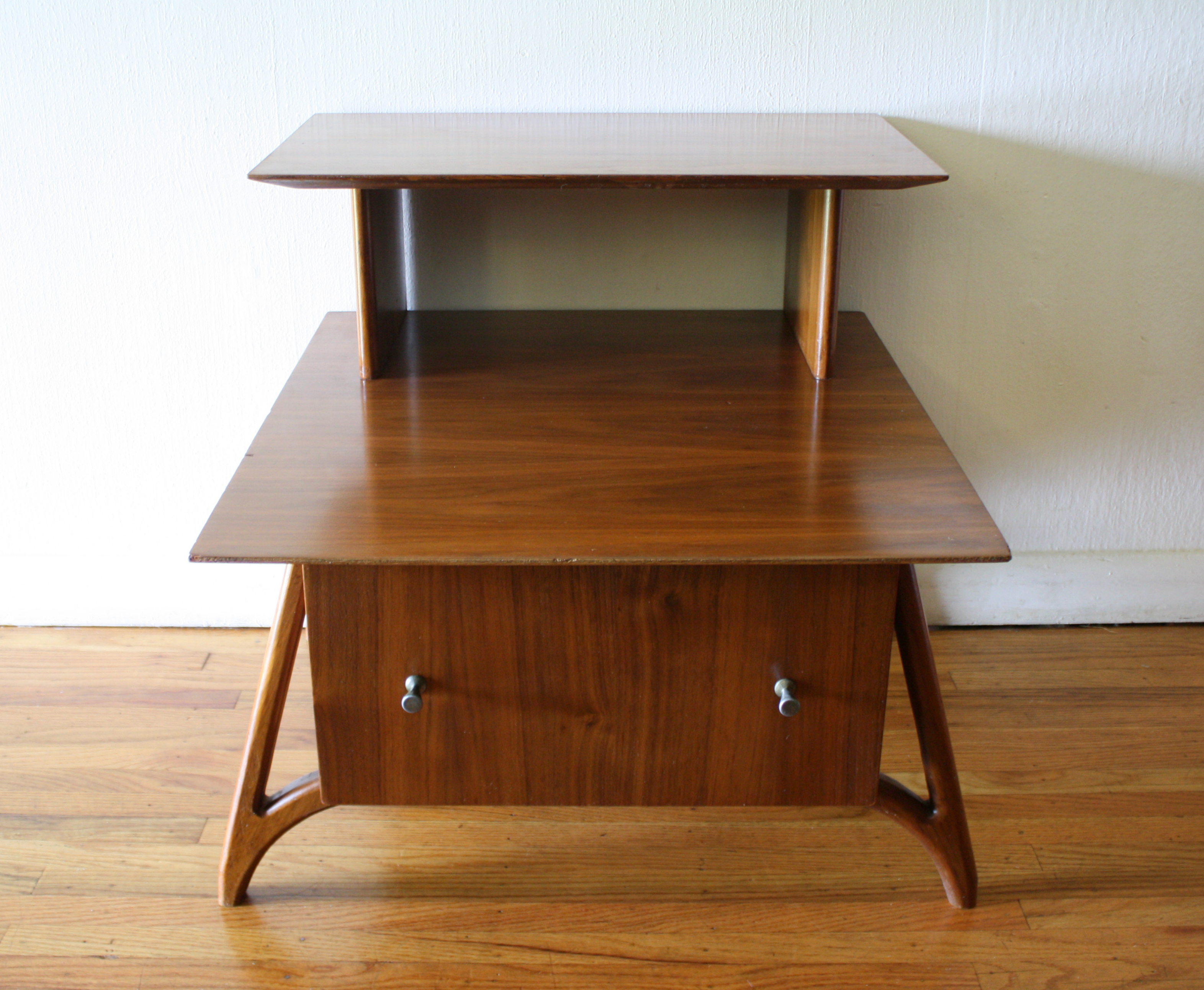 These are 2 mid century modern 2 tiered side end tables. The first 2 tiered table is from the...