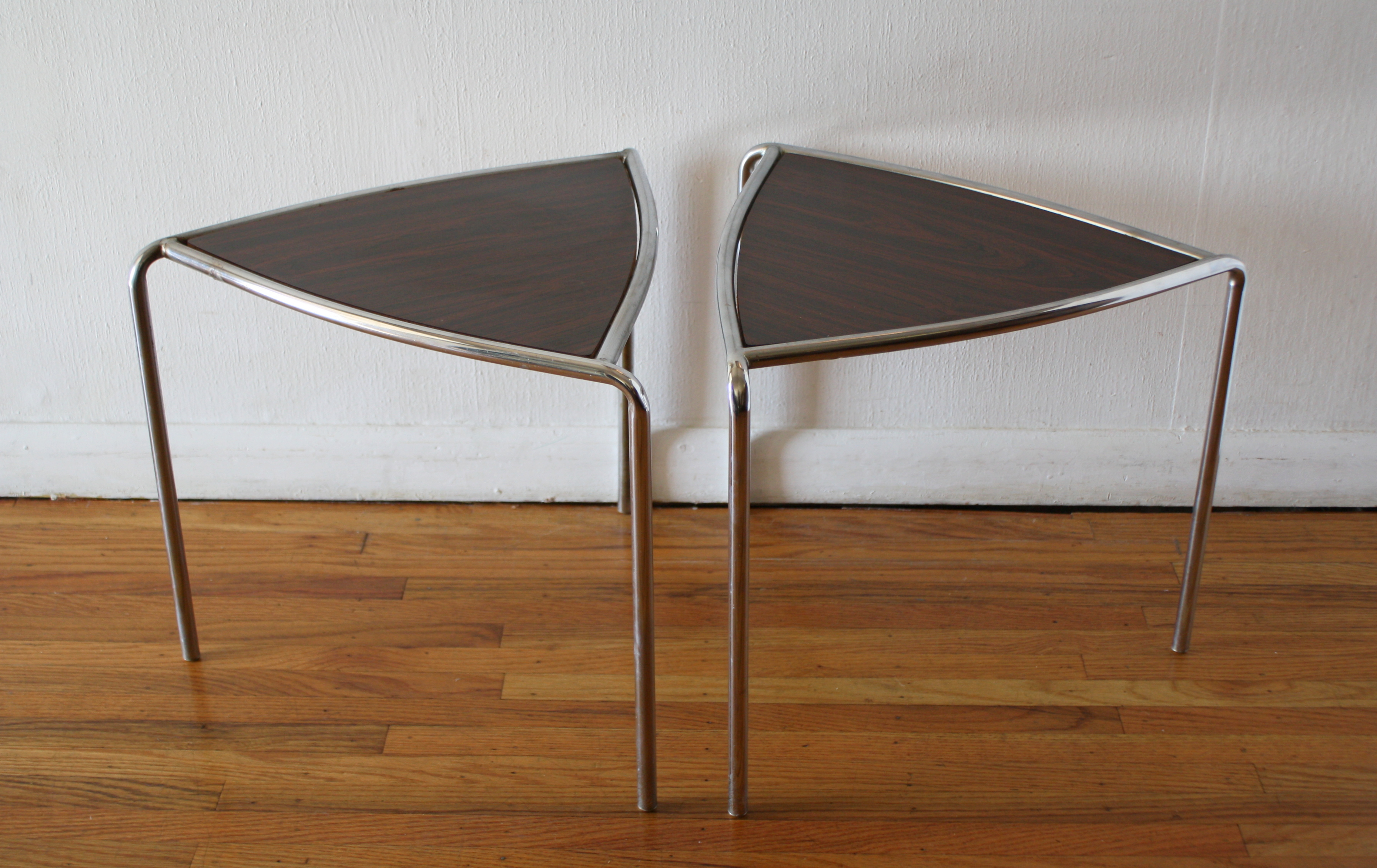 This is a set of mid century modern stacking nesting tables with chrome bases and rosewood tops. Dimensions: 17″W x...