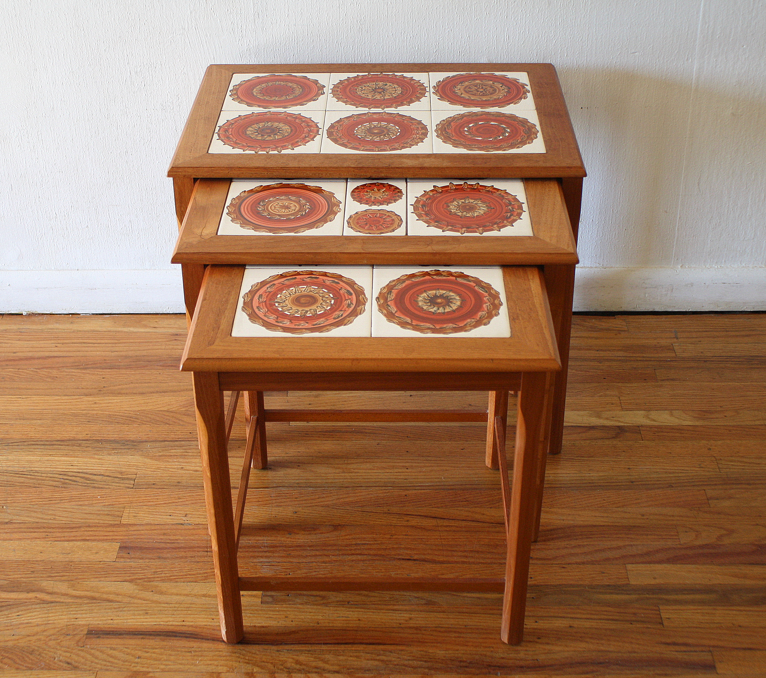 This is a set of mid century modern sets of nesting tile top tables marked made in Denmark. The...