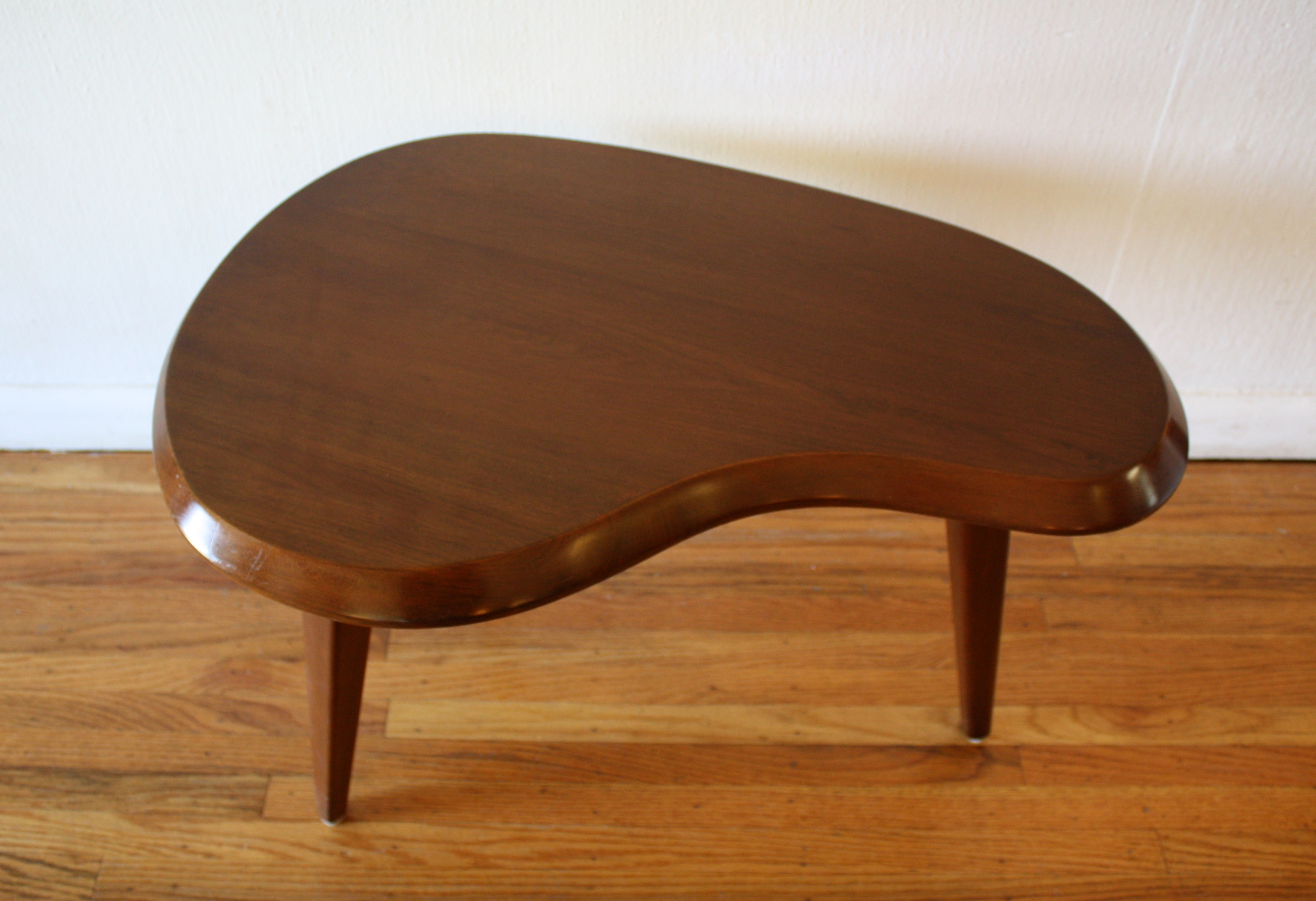 This is a mid century modern solid wood kidney side end table with splayed tapered legs. Dimensions: 26.5″W x 18″D x...