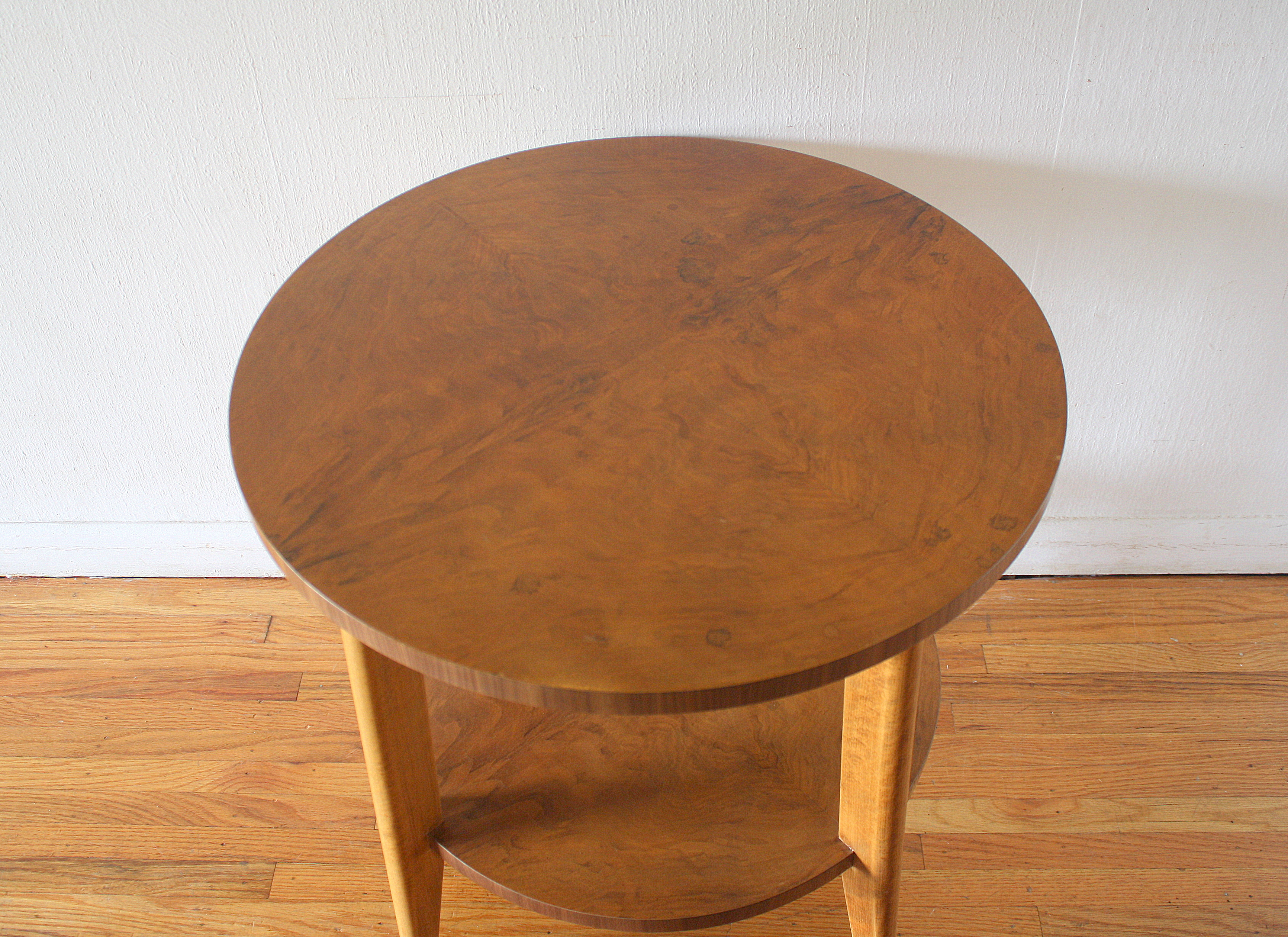 This is a mid century modern side end table with a burl designed top and shelf, and tapered legs....