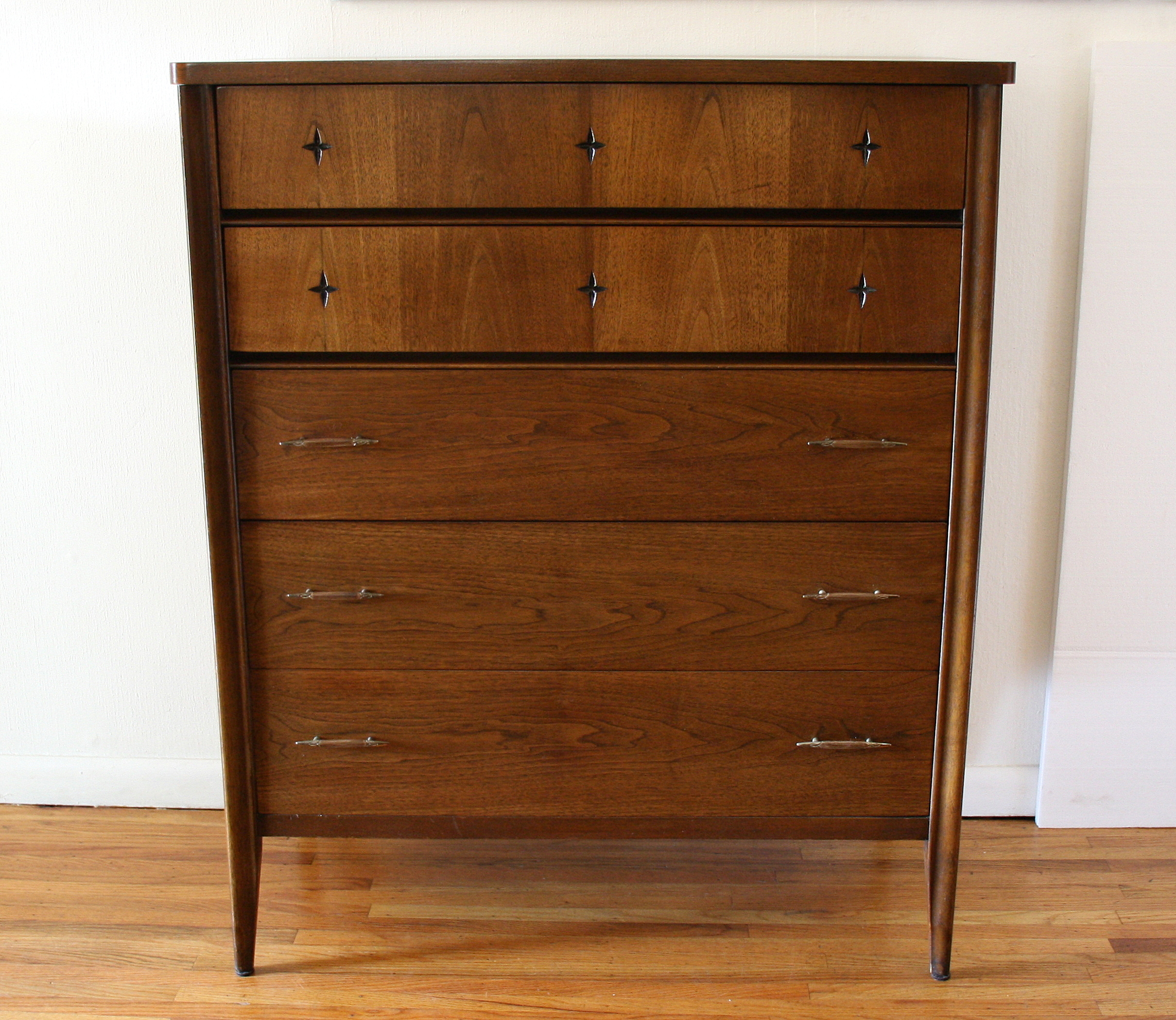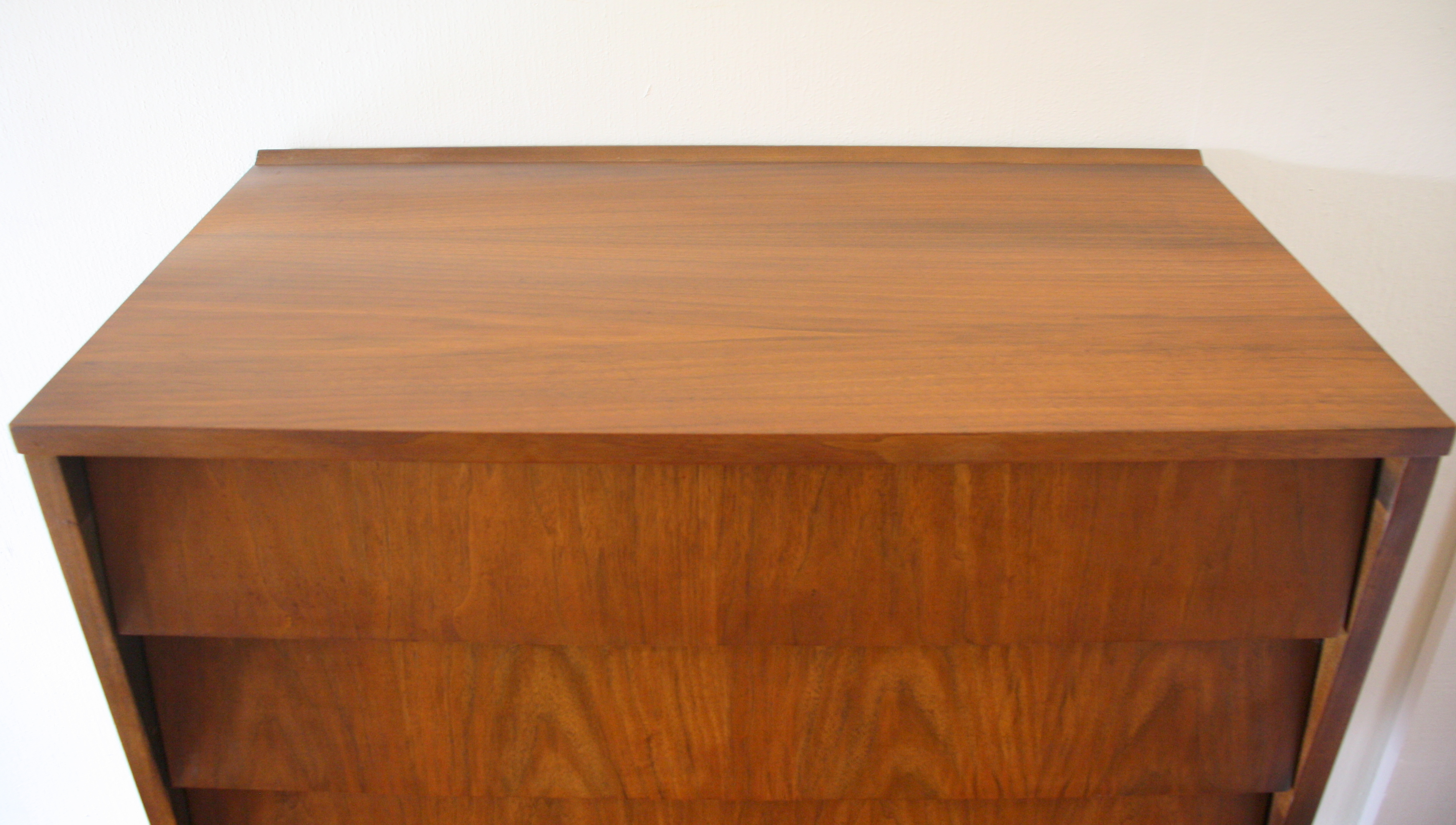 This is a mid century modern tall dresser by United with four dovetailed drawers with angled pulls, and brass...