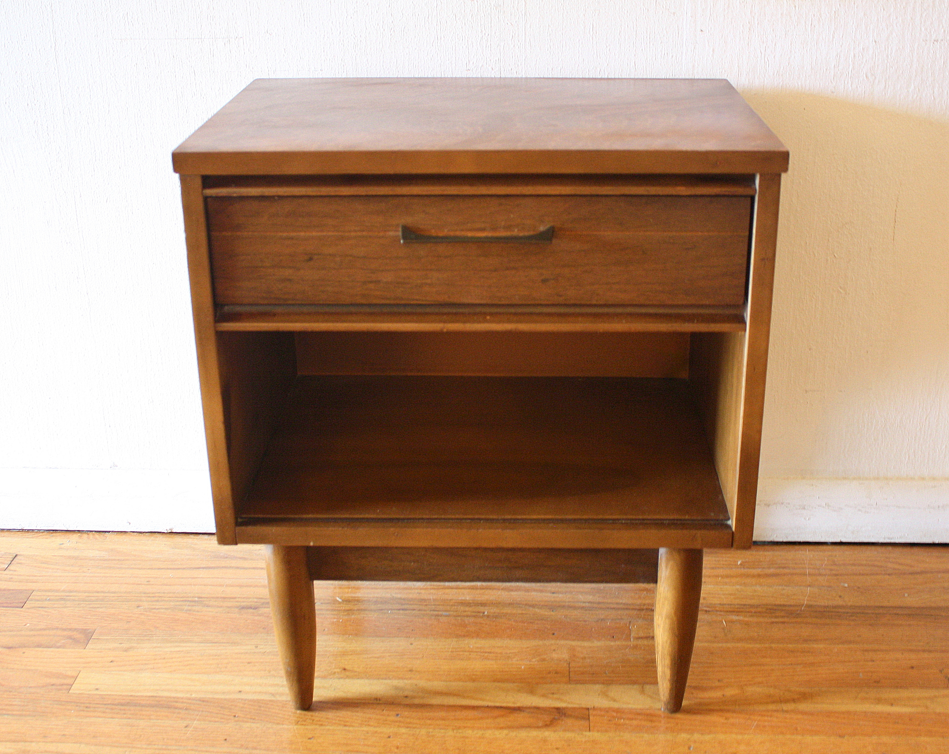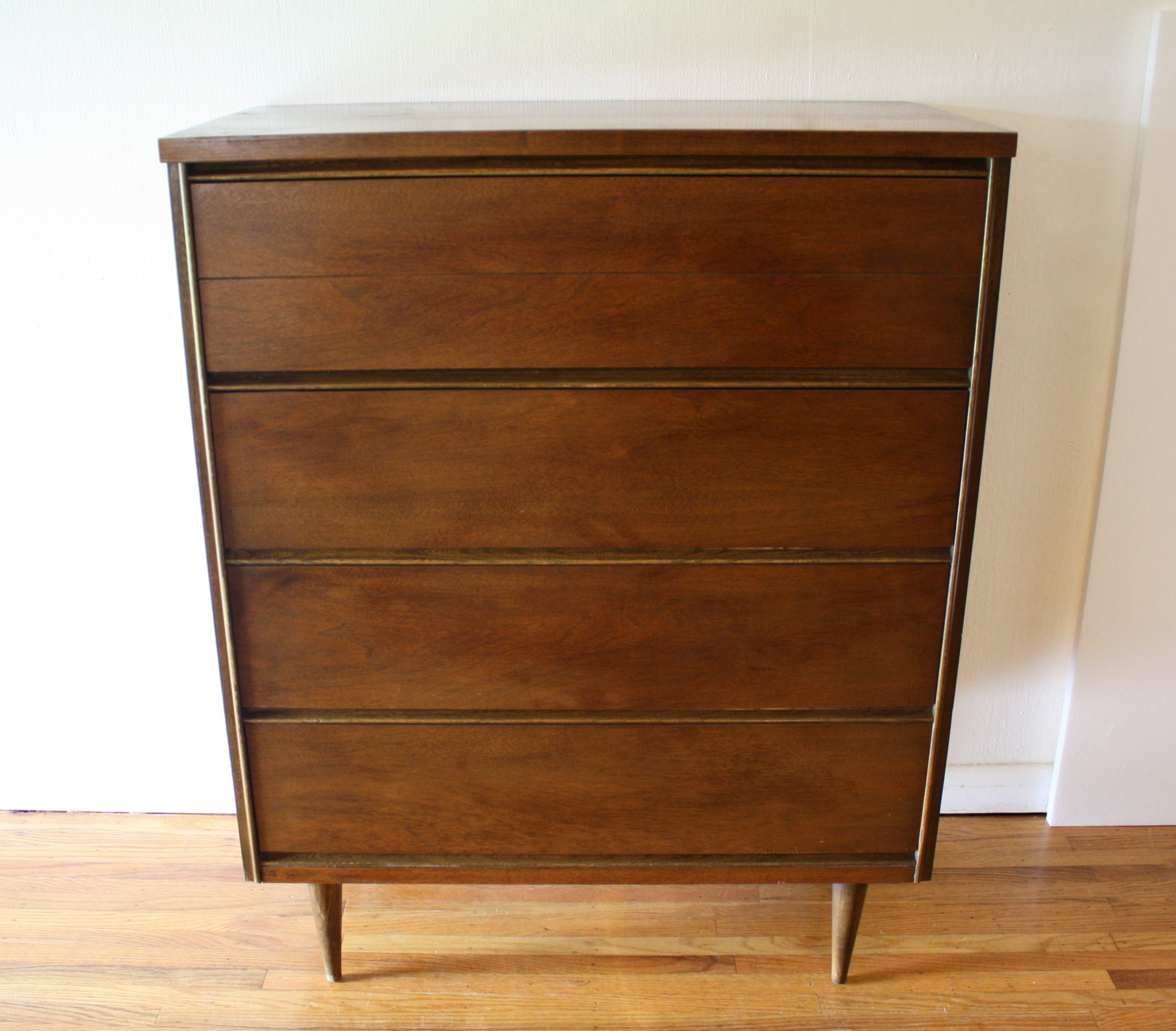 This is a mid century modern tall dresser with 4 dovetailed drawers with sculpted brass handles, and tapered legs:...