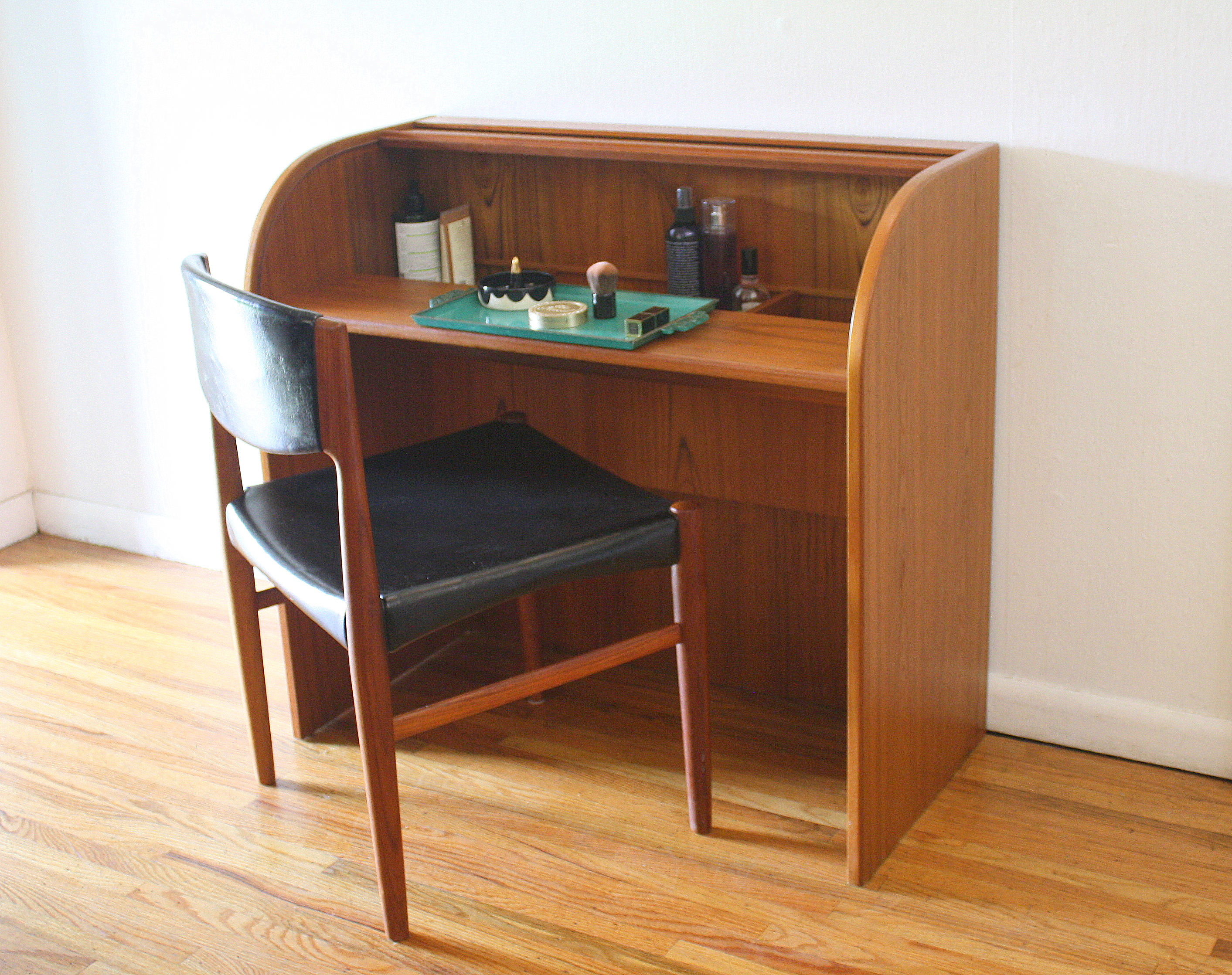This is a mid century modern Danish teak vanity. It has an easy sliding roll top with a beautiful...