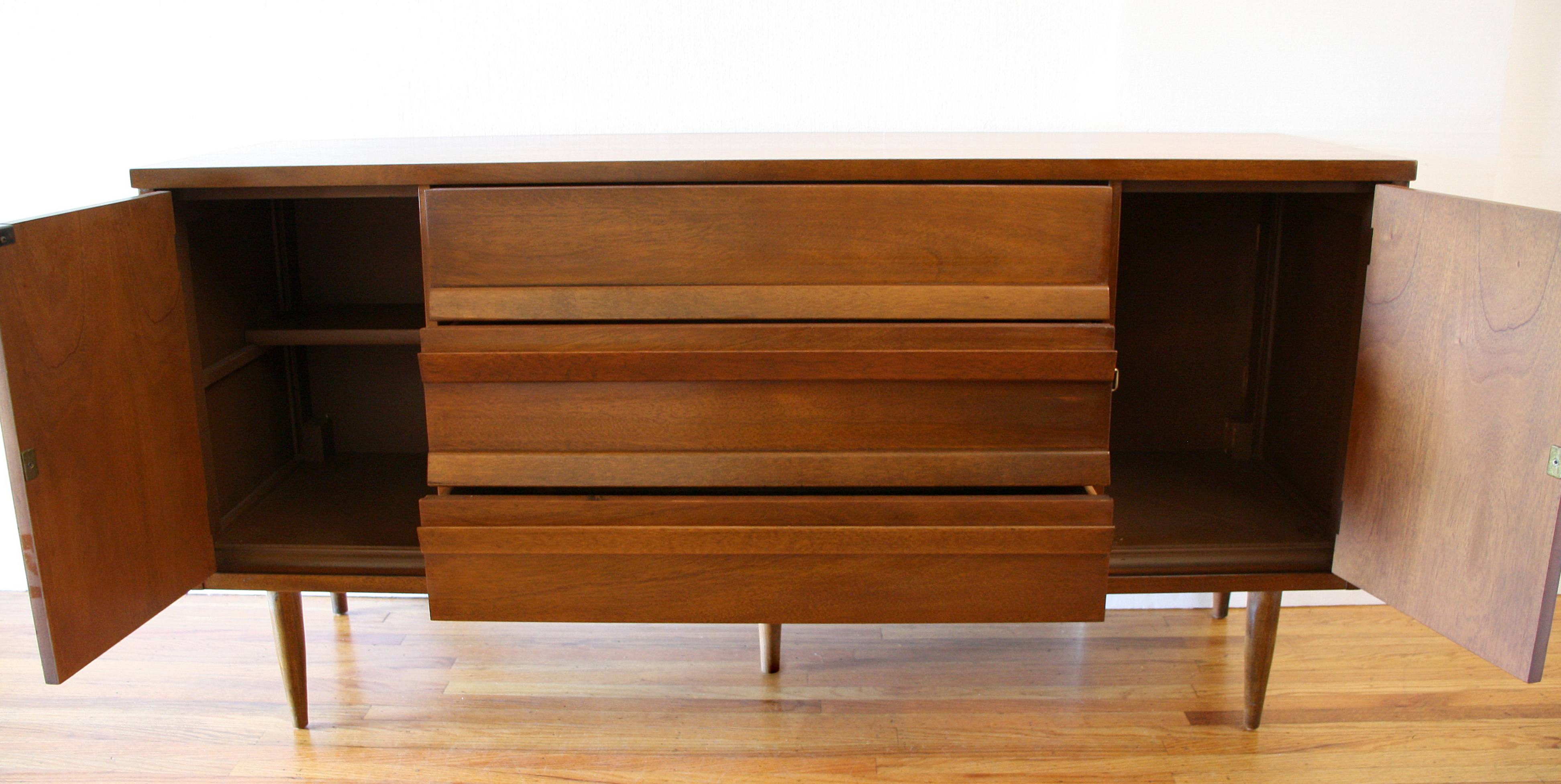 This is a mid century modern credenza by Bassett. It has 3 dovetailed drawers with angled pulls, 2 side...