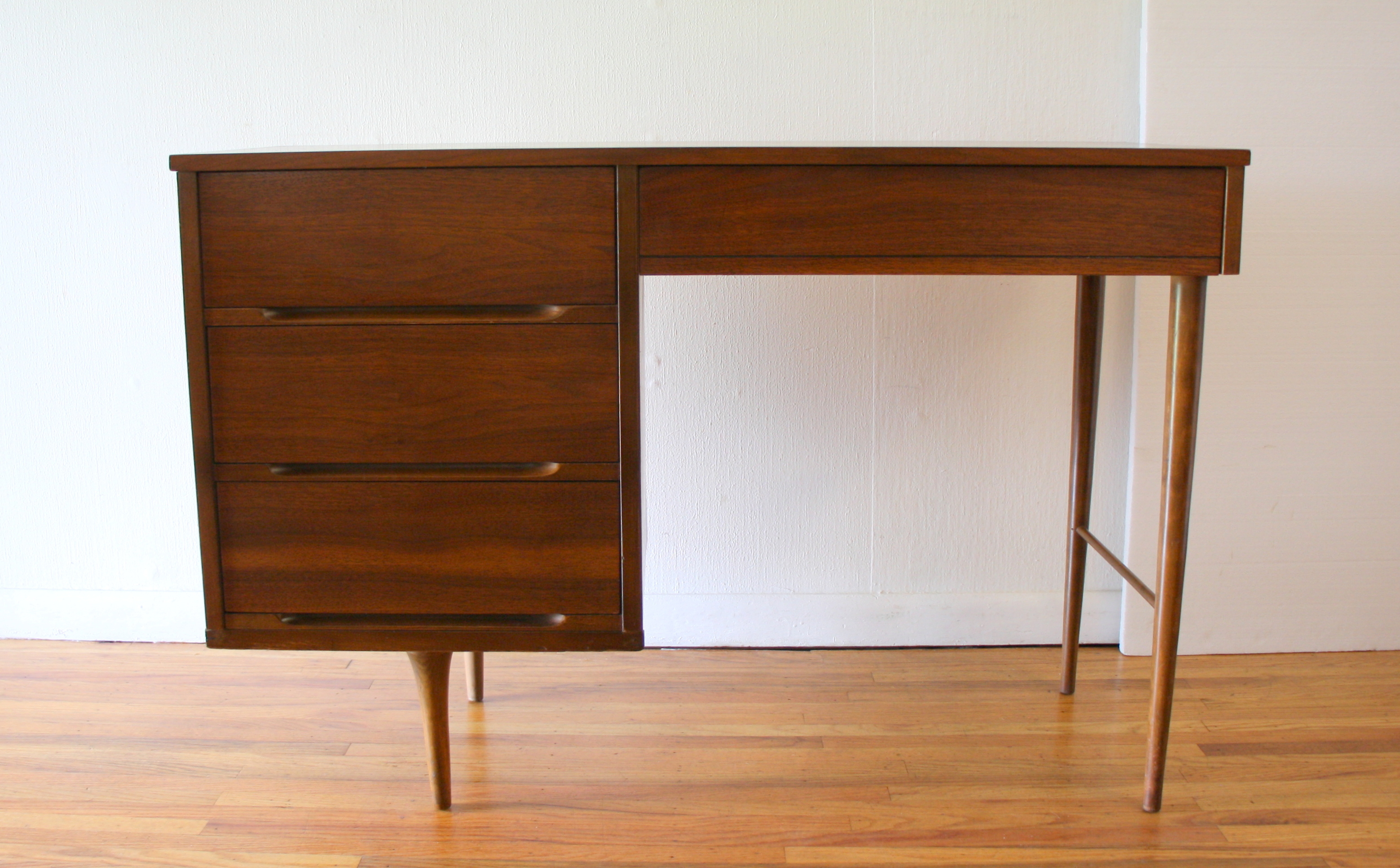 This is a mid century modern desk with a streamlined design, 4 dovetailed drawers, slender tapered legs, and beautiful...