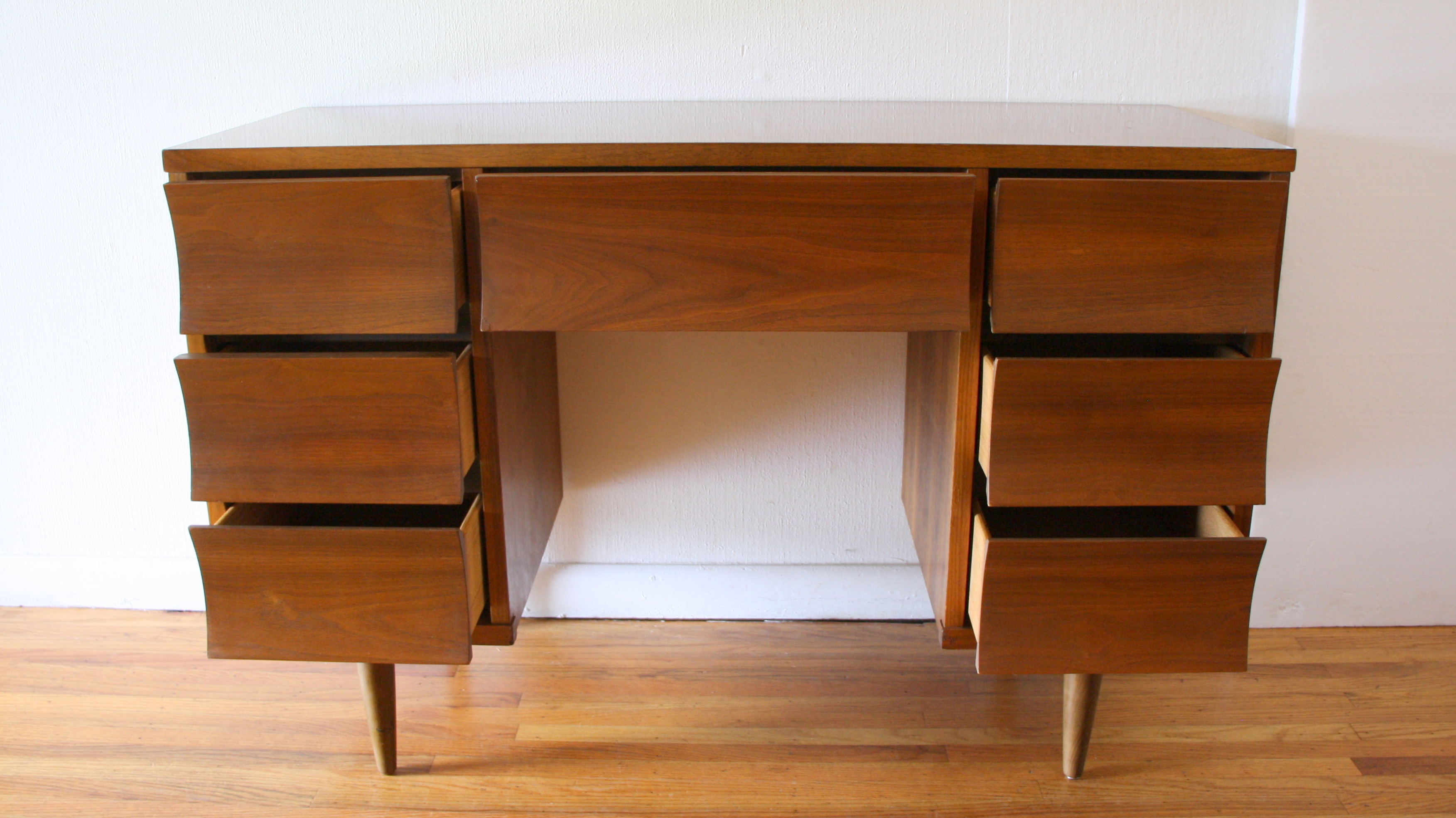 This is a mid century modern desk by Johnson Carper. It has 7 dovetailed drawers with their signature concave...
