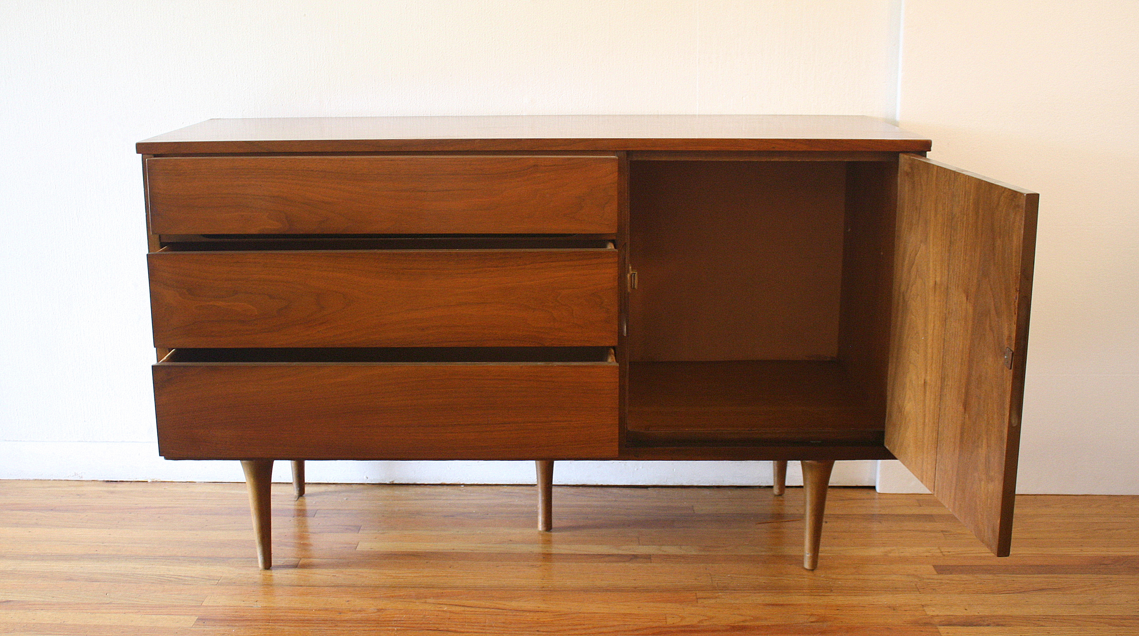 This is a mid century modern credenza that has 3 dovetailed drawers with a streamlined drawer design, right side...