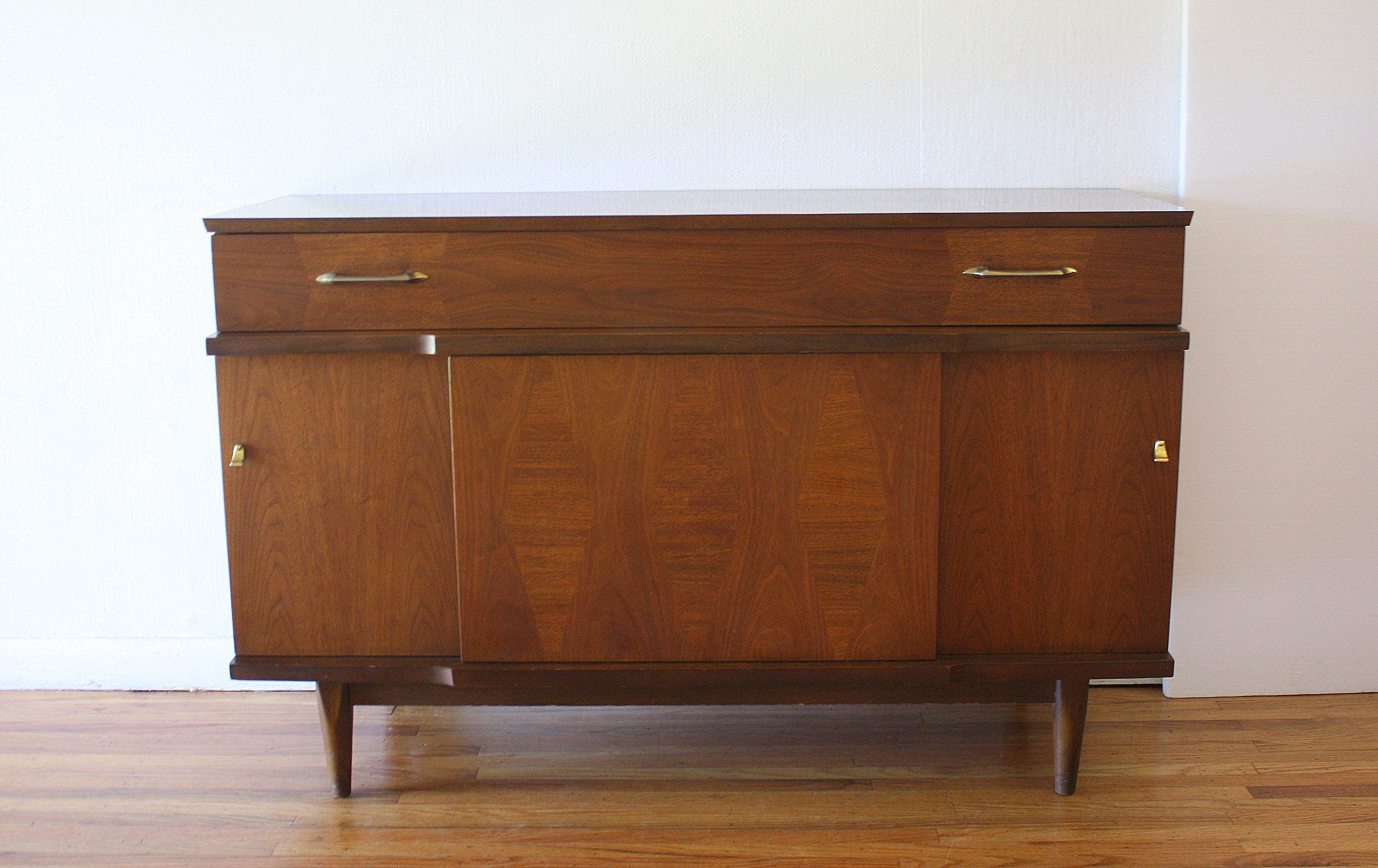 This is a mid century modern credenza with 4 dovetailed drawers, 2 dual side cabinets with brass and wood...