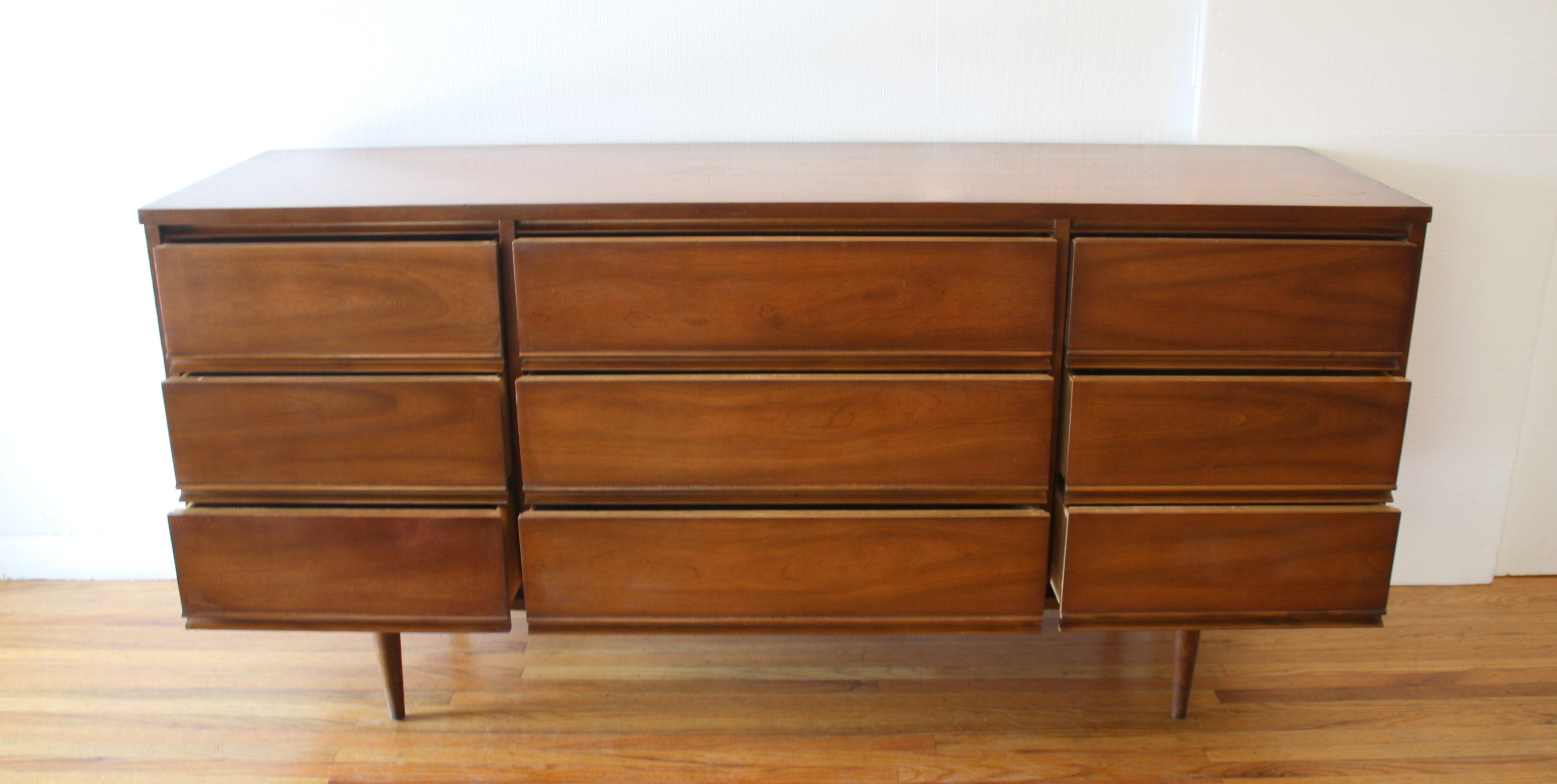 This is a mid century modern low dresser credenza by Harmony House. It has 9 dovetailed drawers with a...